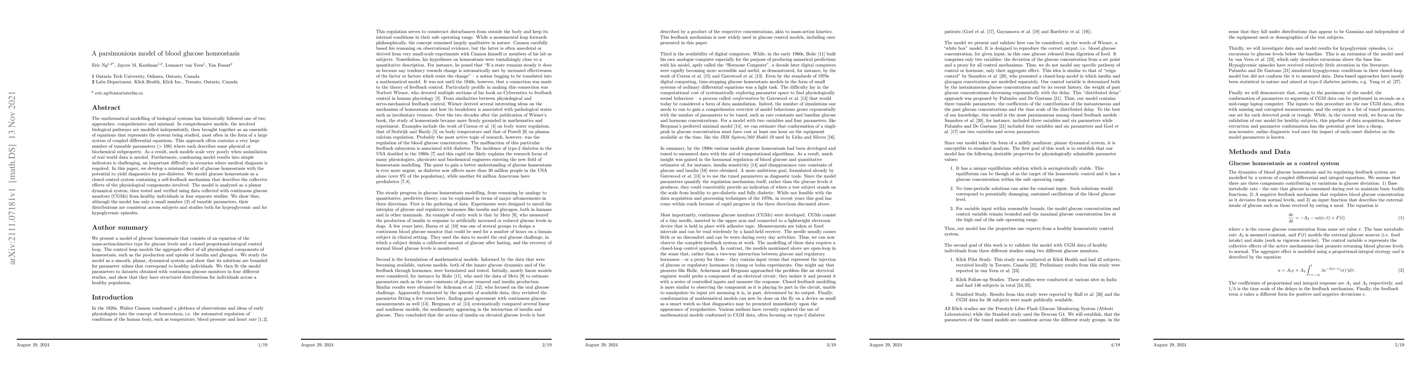 The mathematical modelling of biological systems has historically followed one of two approaches: comprehensive and minimal. In comprehensive models, the involved biological pathways are modelled independently, then brought together as an ensemble of equations that represents the system being studied, most often in the form of a large system of coupled differential equations. This approach often contains a very large number of tuneable parameters (> 100) where each describes some physical or biochemical subproperty. As a result, such models scale very poorly when assimilation of real world data is needed. Furthermore, condensing model results into simple indicators is challenging, an important difficulty in scenarios where medical diagnosis is required. In this paper, we develop a minimal model of glucose homeostasis with the potential to yield diagnostics for pre-diabetes. We model glucose homeostasis as a closed control system containing a self-feedback mechanism that describes the collective effects of the physiological components involved. The model is analyzed as a planar dynamical system, then tested and verified using data collected with continuous glucose monitors (CGMs) from healthy individuals in four separate studies. We show that, although the model has only a small number (3) of tunable parameters, their distribution across subjects has a consistent distribution both for hyperglycemic and for hypoglycemic episodes.