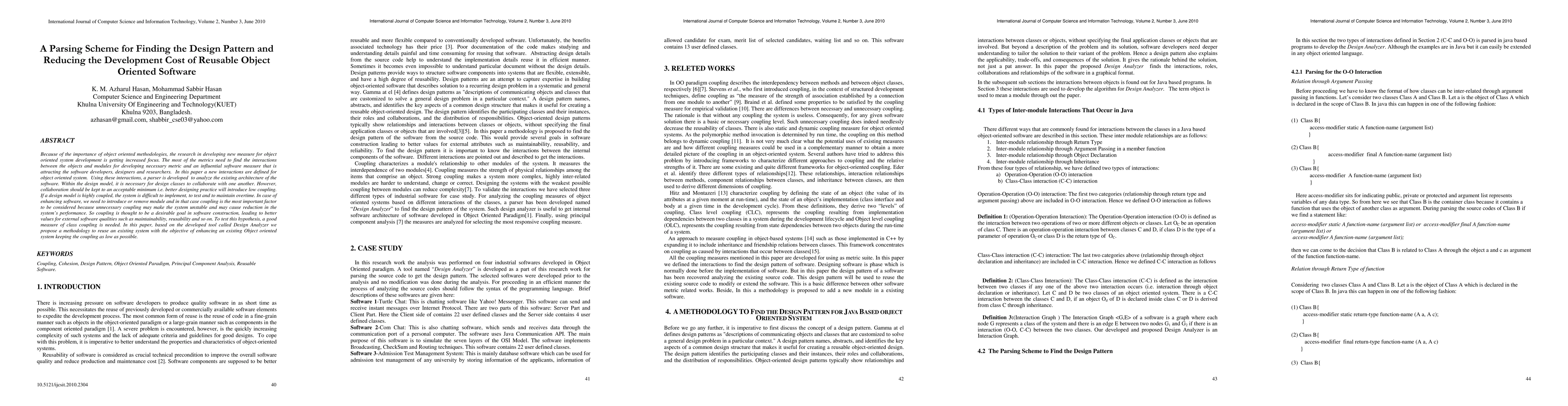 This paper proposes a new parsing scheme to identify interactions in object-oriented systems, aiming to reduce development costs by minimizing class coupling. The developed Design Analyzer tool helps in analyzing and reusing existing software architectures to enhance maintainability and reusability.