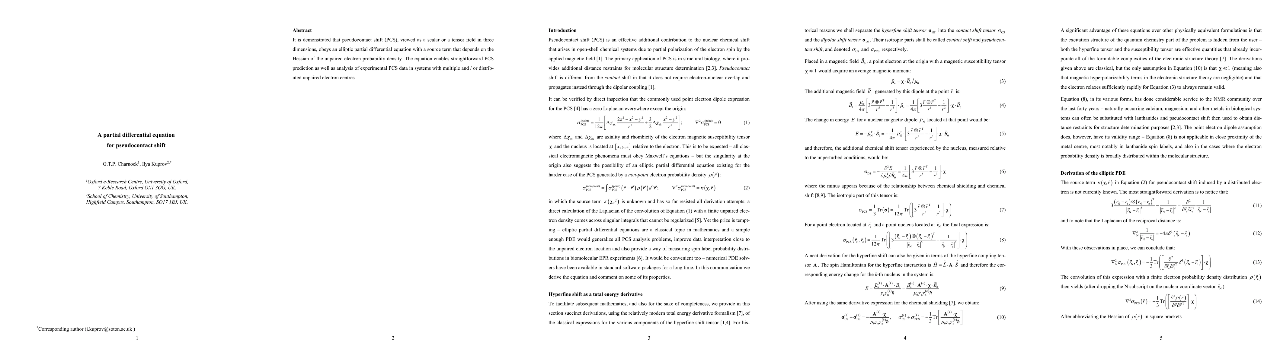 It is demonstrated that pseudocontact shift (PCS), viewed as a scalar or a tensor field in three dimensions, obeys an elliptic partial differential equation with a source term that depends on the Hessian of the unpaired electron probability density. The equation enables straightforward PCS prediction as well as analysis of experimental PCS data in systems with multiple and / or distributed unpaired electron centres.