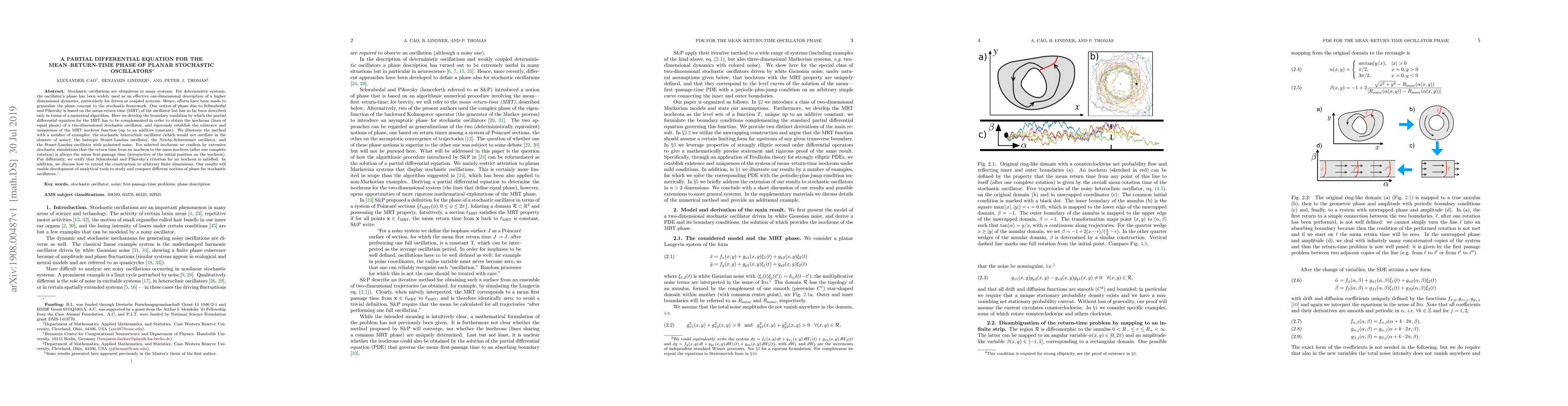This paper develops a partial differential equation for the mean-return-time phase of planar stochastic oscillators, establishing the existence and uniqueness of the MRT isochron function. It illustrates the method with various examples and confirms the criterion for isochrons through stochastic simulations.