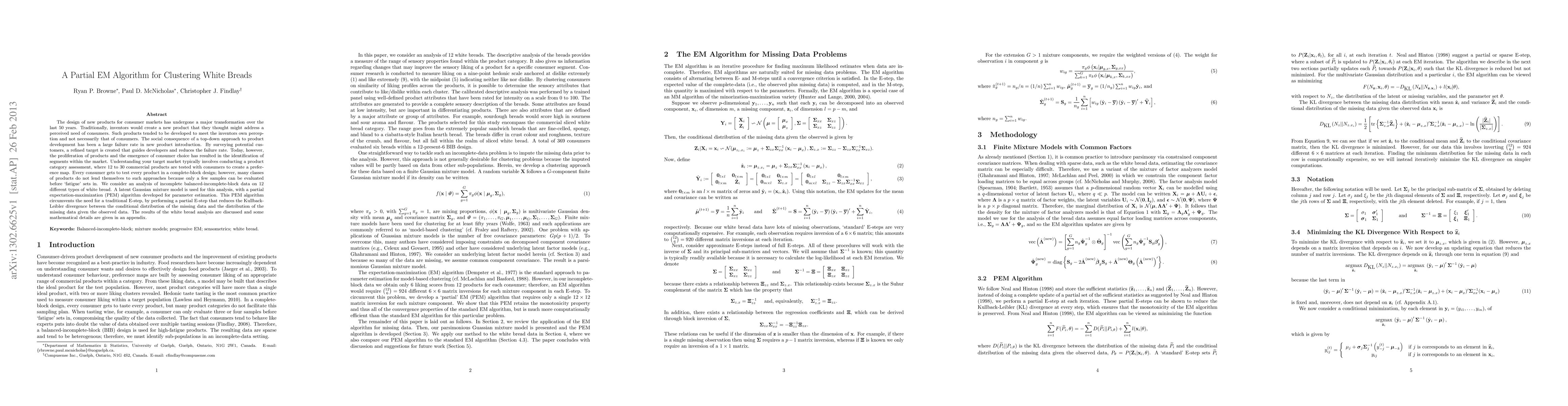 The design of new products for consumer markets has undergone a major transformation over the last 50 years. Traditionally, inventors would create a new product that they thought might address a perceived need of consumers. Such products tended to be developed to meet the inventors own perception and not necessarily that of consumers. The social consequence of a top-down approach to product development has been a large failure rate in new product introduction. By surveying potential customers, a refined target is created that guides developers and reduces the failure rate. Today, however, the proliferation of products and the emergence of consumer choice has resulted in the identification of segments within the market. Understanding your target market typically involves conducting a product category assessment, where 12 to 30 commercial products are tested with consumers to create a preference map. Every consumer gets to test every product in a complete-block design; however, many classes of products do not lend themselves to such approaches because only a few samples can be evaluated before `fatigue' sets in. We consider an analysis of incomplete balanced-incomplete-block data on 12 different types of white bread. A latent Gaussian mixture model is used for this analysis, with a partial expectation-maximization (PEM) algorithm developed for parameter estimation. This PEM algorithm circumvents the need for a traditional E-step, by performing a partial E-step that reduces the Kullback-Leibler divergence between the conditional distribution of the missing data and the distribution of the missing data given the observed data. The results of the white bread analysis are discussed and some mathematical details are given in an appendix.