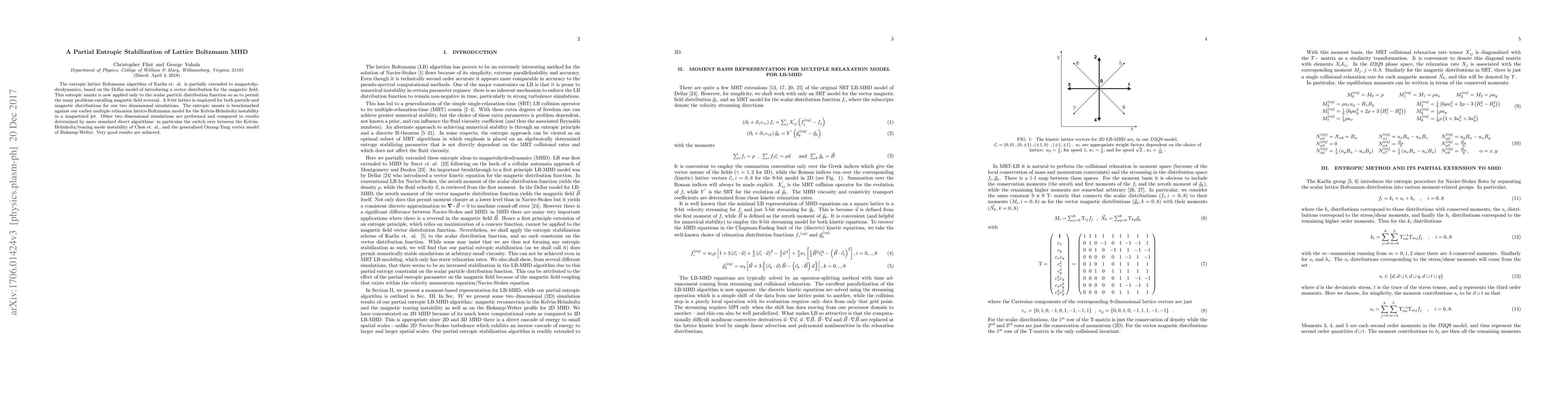 The entropic lattice Boltzmann algorithm of Karlin et. al. is partially extended to magnetohydrodynamics, based on the Dellar model of introducing a vector distribution for the magnetic field. This entropic ansatz is now applied only to the scalar particle distribution function so as to permit the many problems entailing magnetic field reversal. A 9-bit lattice is employed for both particle and magnetic distributions for our two dimensional simulations. The entropic ansatz is benchmarked against our earlier multiple relaxation lattice-Boltzmann model for the Kelvin-Helmholtz instability in a magnetized jet. Other two dimensional simulations are performed and compared to results determined by more standard direct algorithms: in particular the switch over between the Kelvin-Helmholtz/tearing mode instability of Chen et. al., and the generalized Orszag-Tang vortex model of Biskamp-Welter. Very good results are achieved.