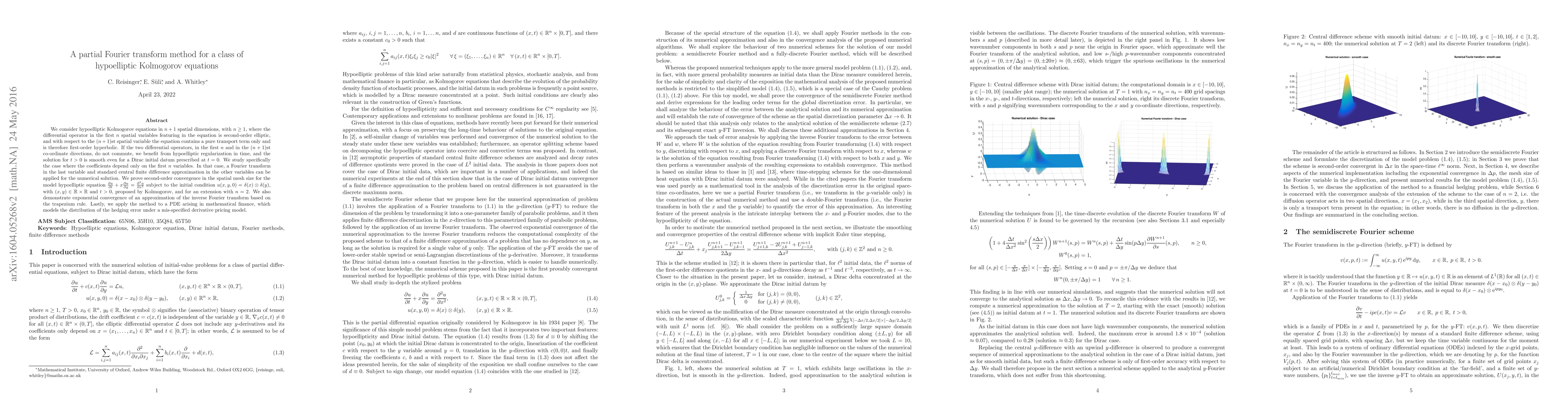 This paper proposes a partial Fourier transform method for solving hypoelliptic Kolmogorov equations, demonstrating second-order convergence for a specific model equation and exponential convergence for its inverse Fourier transform approximation. The method is applied to a PDE in mathematical finance modeling hedging error.