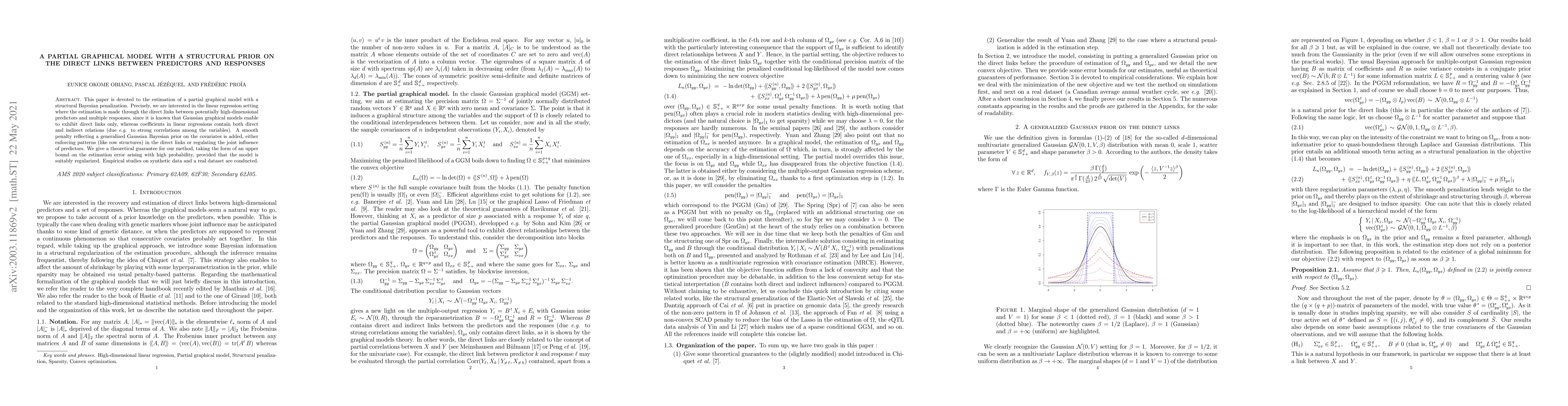This paper is devoted to the estimation of a partial graphical model with a structural Bayesian penalization. Precisely, we are interested in the linear regression setting where the estimation is made through the direct links between potentially high-dimensional predictors and multiple responses, since it is known that Gaussian graphical models enable to exhibit direct links only, whereas coefficients in linear regressions contain both direct and indirect relations (due \textit{e.g.} to strong correlations among the variables). A smooth penalty reflecting a generalized Gaussian Bayesian prior on the covariates is added, either enforcing patterns (like row structures) in the direct links or regulating the joint influence of predictors. We give a theoretical guarantee for our method, taking the form of an upper bound on the estimation error arising with high probability, provided that the model is suitably regularized. Empirical studies on synthetic data and a real dataset are conducted.