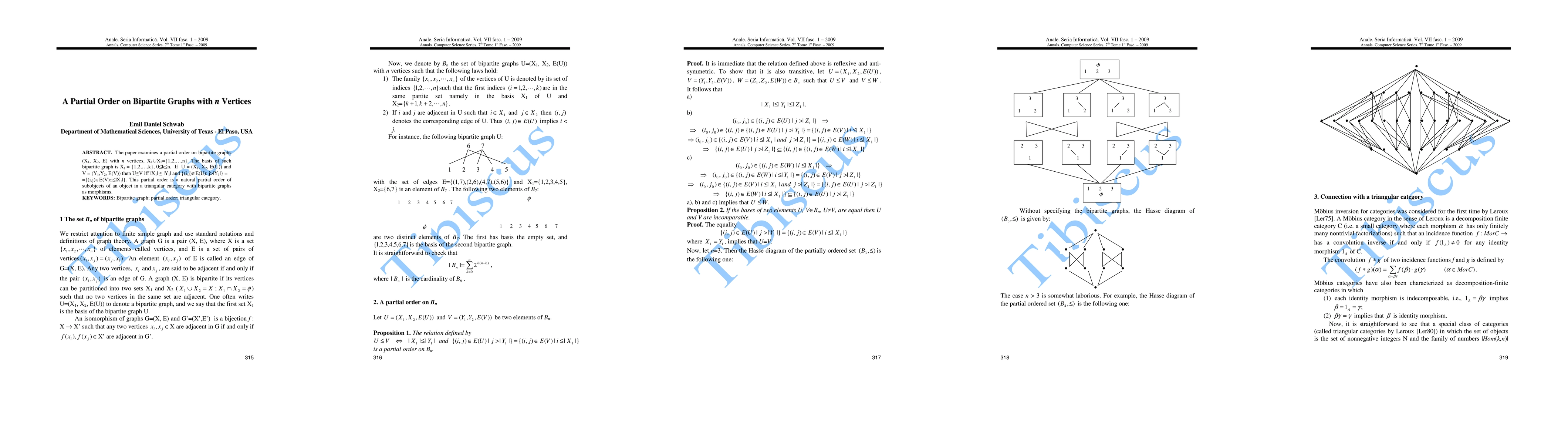 The paper introduces a partial order on bipartite graphs with n vertices, establishing a natural subobject ordering within a triangular category where bipartite graphs serve as morphisms. This order reflects relationships among the subobjects of the category.