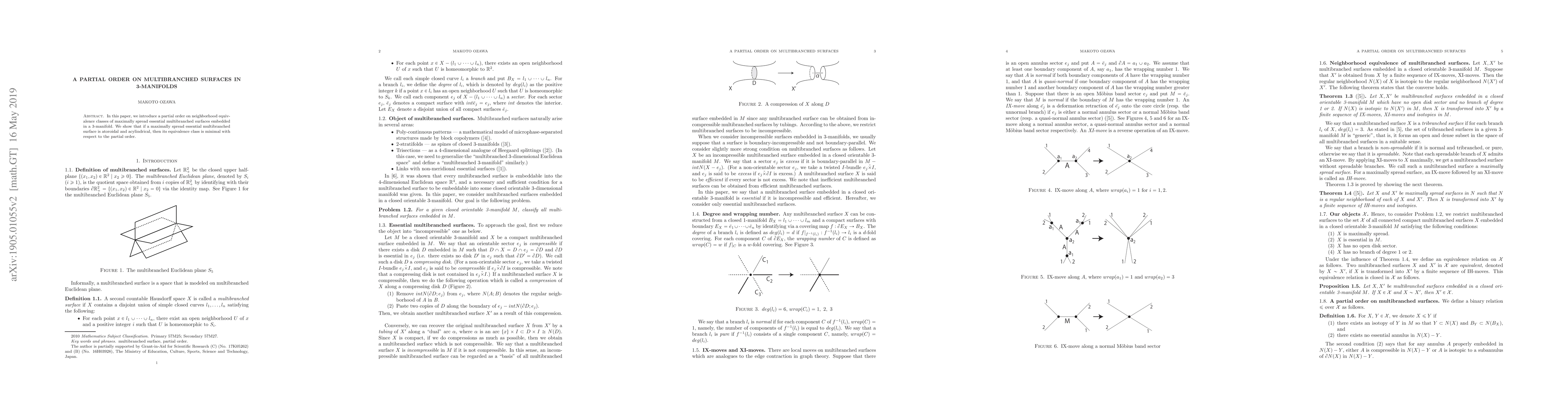 Summary: This paper establishes a partial order on neighborhood equivalence classes of multibranched surfaces in 3-manifolds, demonstrating that atoroidal and acylindrical maximally spread essential multibranched surfaces have minimal equivalence classes under this order.