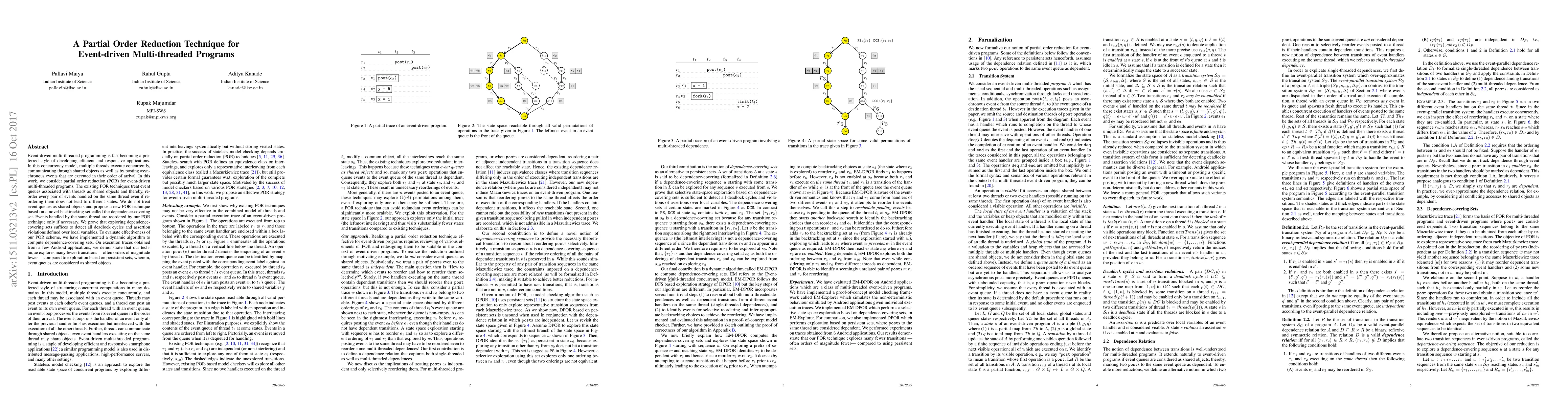 This paper proposes a new partial order reduction technique for event-driven multi-threaded programs, avoiding unnecessary event reordering by introducing a dependence-covering set. The technique significantly reduces the number of explored transitions compared to traditional methods that treat event queues as shared objects.