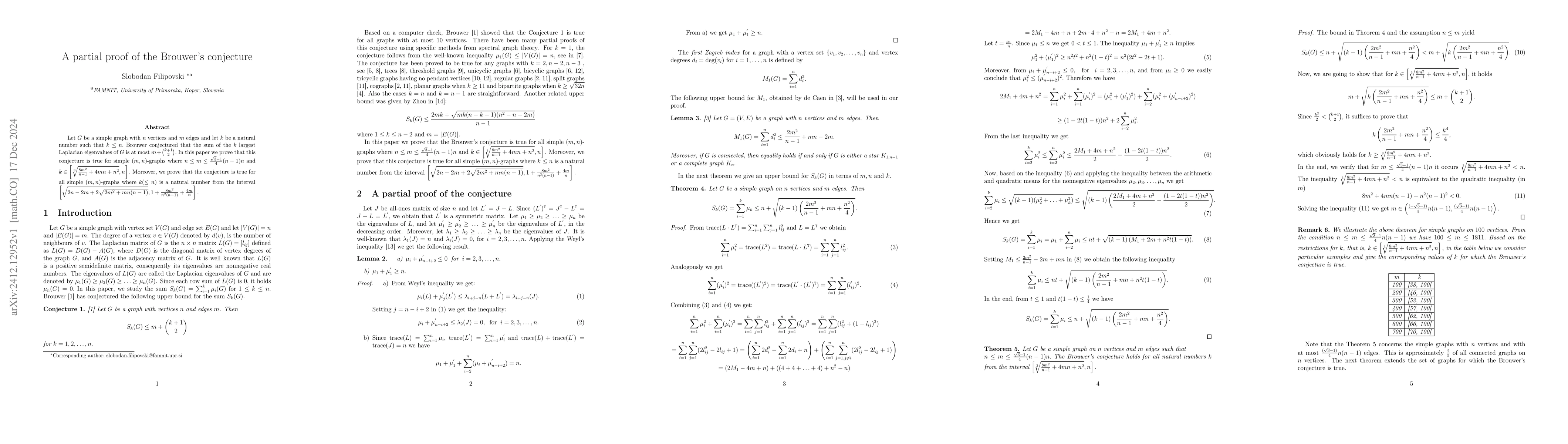 This research provides a partial proof of Brouwer's conjecture, showing it holds for specific ranges of graph parameters, including when the number of edges $m$ is less than or equal to $\frac{\sqrt{3}-1}{4}(n-1)n$ and the largest eigenvalue indices $k$ fall within specified intervals.