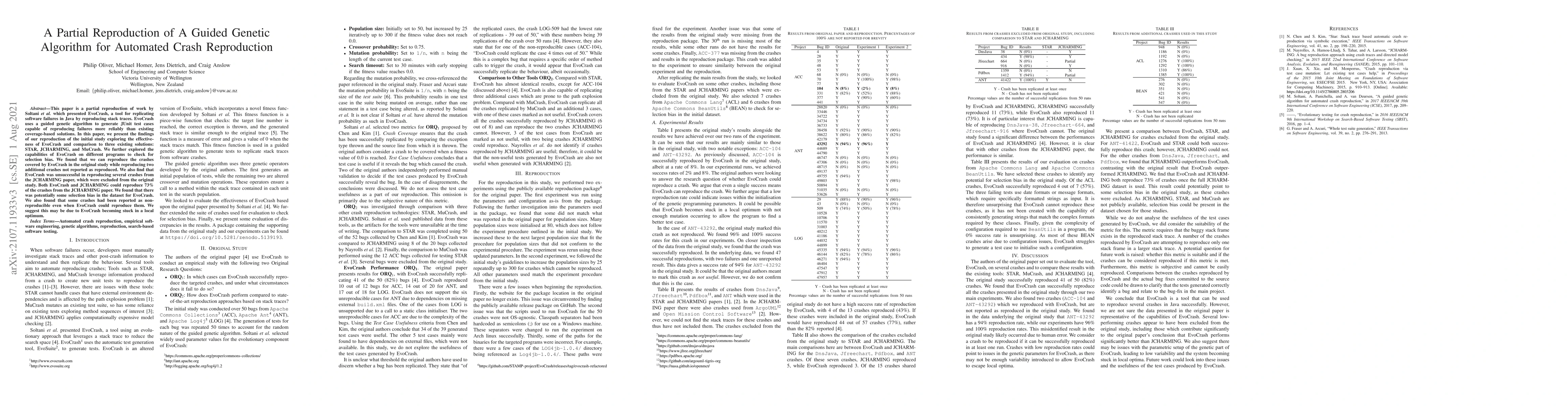 This paper partially reproduces EvoCrash, a genetic algorithm for reproducing Java software failures, finding it can reproduce additional crashes not noted in the original study. However, it also identifies cases where EvoCrash failed, suggesting potential selection bias and local optimum issues.