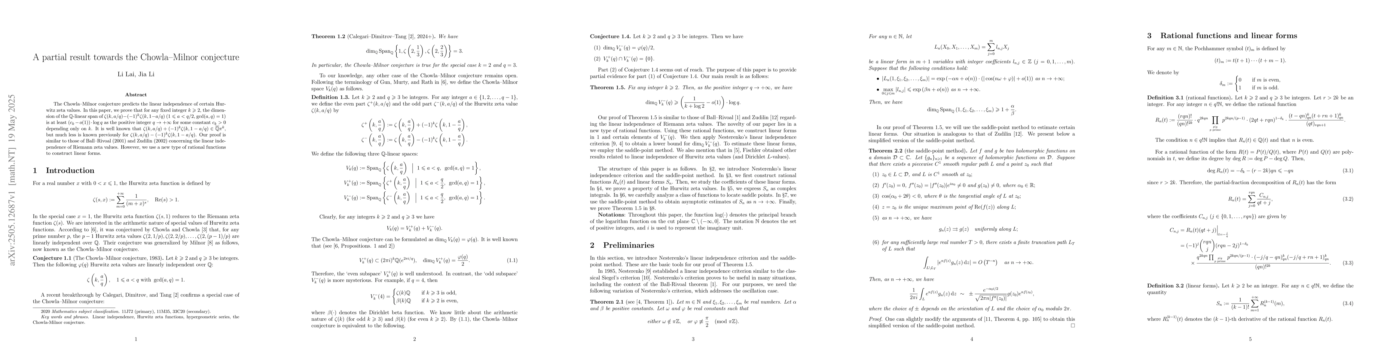 This research contributes to understanding the linear independence of Hurwitz zeta values, which is crucial for the Chowla--Milnor conjecture, potentially impacting number theory and analytic number theory.