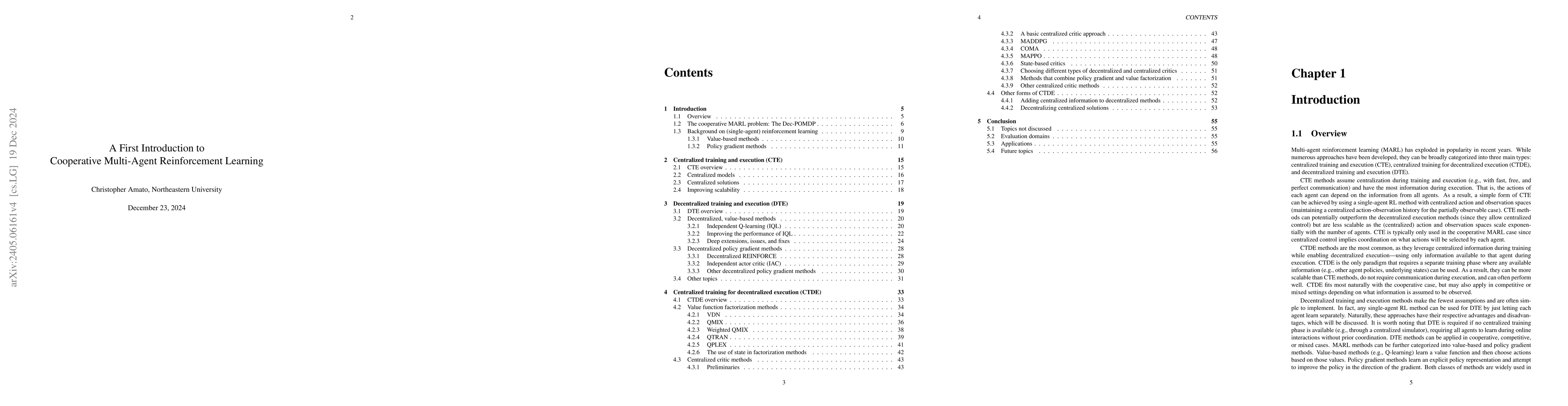 This paper surveys decentralized, cooperative multi-agent reinforcement learning (MARL) focusing on decentralized training and execution (DTE) methods. It discusses value-based DTE methods, including independent Q-learning and deep Q-learning (DQN), and policy gradient DTE methods, including independent REINFORCE and actor-critic approaches like independent PPO, highlighting challenges and solutions for each.