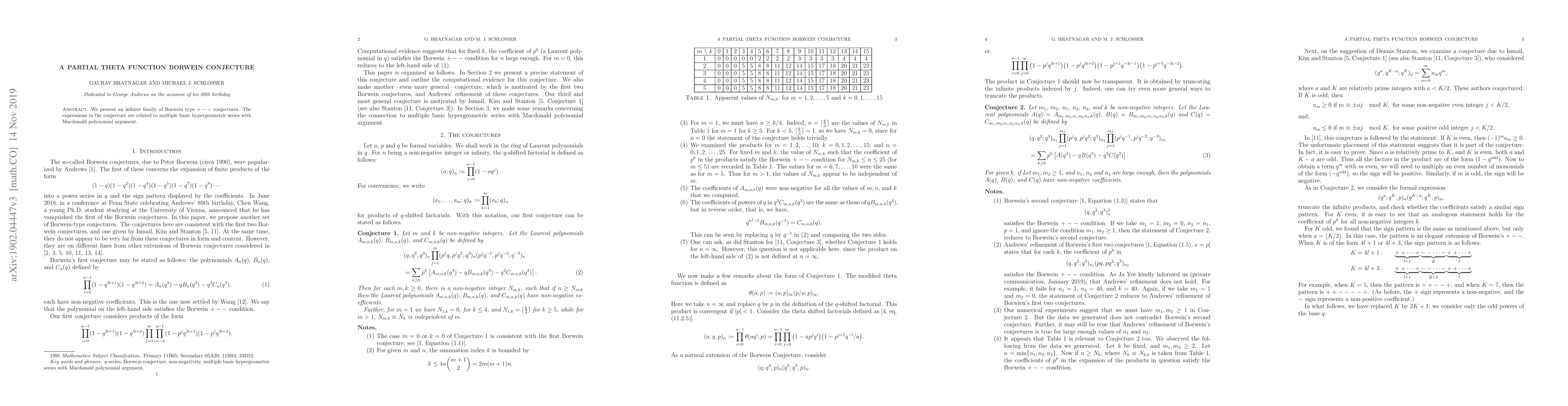 Summary: This paper introduces an infinite family of Borwein type $+ - -$ conjectures connected to multiple basic hypergeometric series and Macdonald polynomial arguments. The conjectures are significant in the study of advanced mathematical functions.