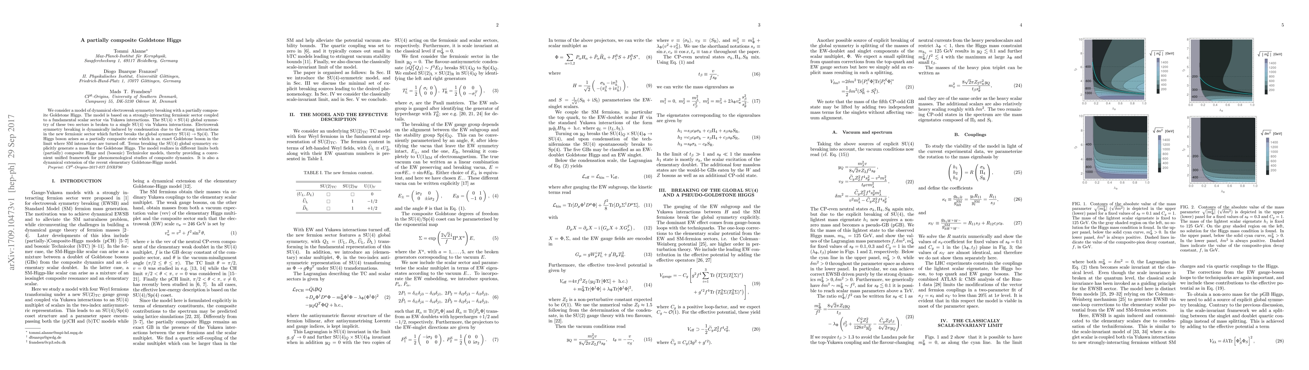 This paper proposes a model of dynamical electroweak symmetry breaking featuring a partially composite Goldstone Higgs, where strong interactions in a fermionic sector induce symmetry breaking and generate a Higgs boson that is both a composite state and an exact Goldstone boson. The study unifies composite Higgs and Technicolor models within a single framework.