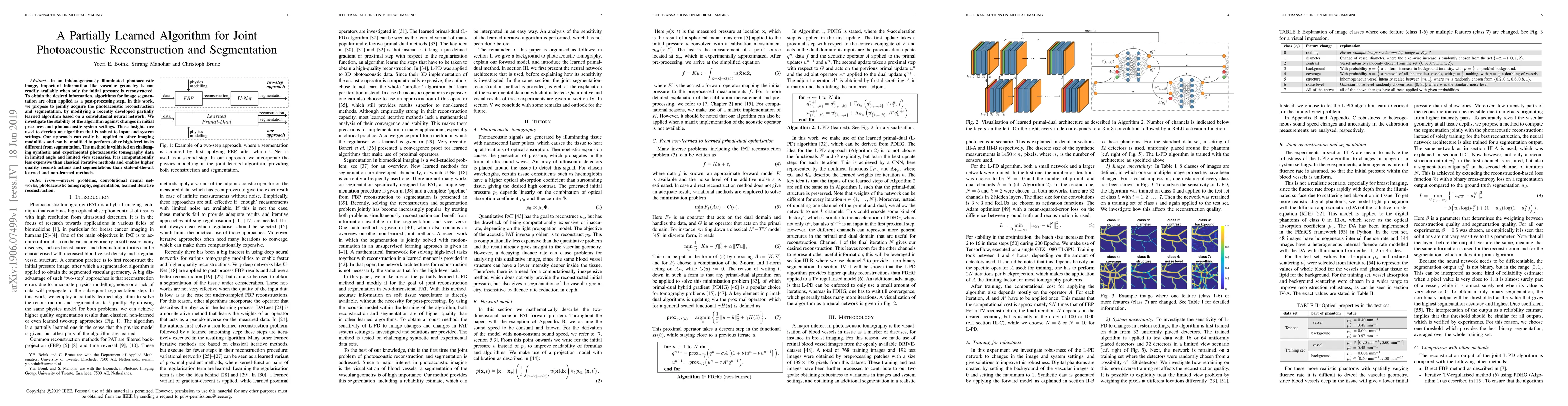 This paper proposes a partially learned algorithm based on convolutional neural networks for joint photoacoustic reconstruction and segmentation, demonstrating robustness against variations in initial pressures and system settings. The method is computationally efficient and outperforms existing methods in quality of reconstructions and segmentations.