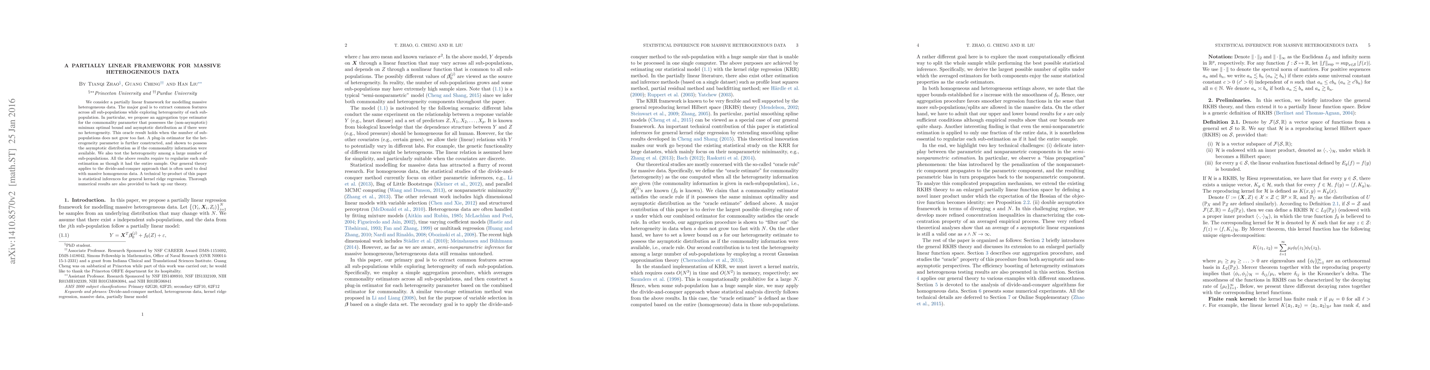We consider a partially linear framework for modelling massive heterogeneous data. The major goal is to extract common features across all sub-populations while exploring heterogeneity of each sub-population. In particular, we propose an aggregation type estimator for the commonality parameter that possesses the (non-asymptotic) minimax optimal bound and asymptotic distribution as if there were no heterogeneity. This oracular result holds when the number of sub-populations does not grow too fast. A plug-in estimator for the heterogeneity parameter is further constructed, and shown to possess the asymptotic distribution as if the commonality information were available. We also test the heterogeneity among a large number of sub-populations. All the above results require to regularize each sub-estimation as though it had the entire sample size. Our general theory applies to the divide-and-conquer approach that is often used to deal with massive homogeneous data. A technical by-product of this paper is the statistical inferences for the general kernel ridge regression. Thorough numerical results are also provided to back up our theory.