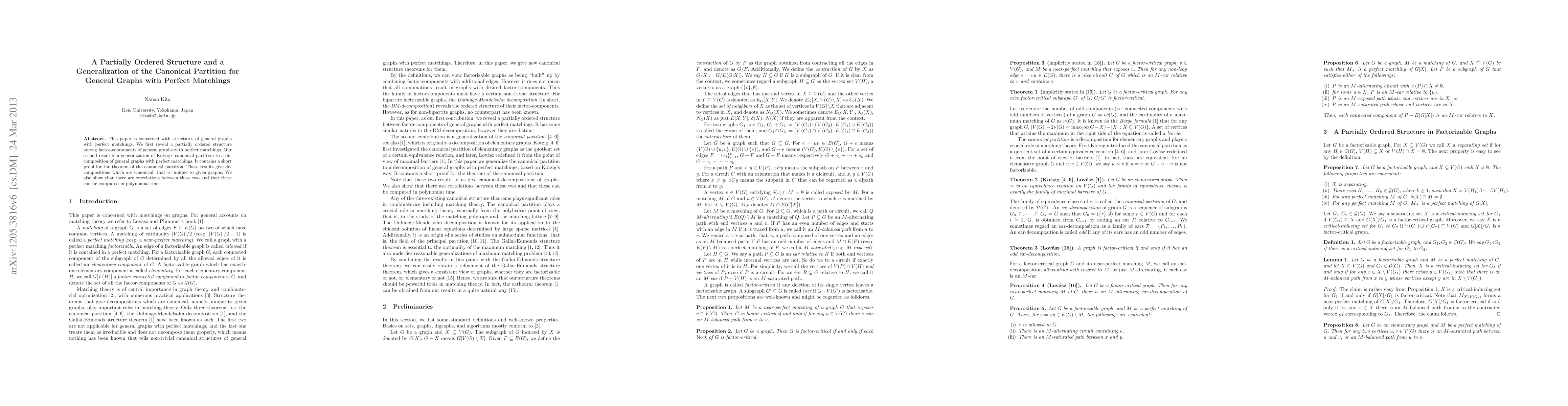 This paper is concerned with structures of general graphs with perfect matchings. We first reveal a partially ordered structure among factor-components of general graphs with perfect matchings. Our second result is a generalization of Kotzig's canonical partition to a decomposition of general graphs with perfect matchings. It contains a short proof for the theorem of the canonical partition. These results give decompositions which are canonical, that is, unique to given graphs. We also show that there are correlations between these two and that these can be computed in polynomial time.
