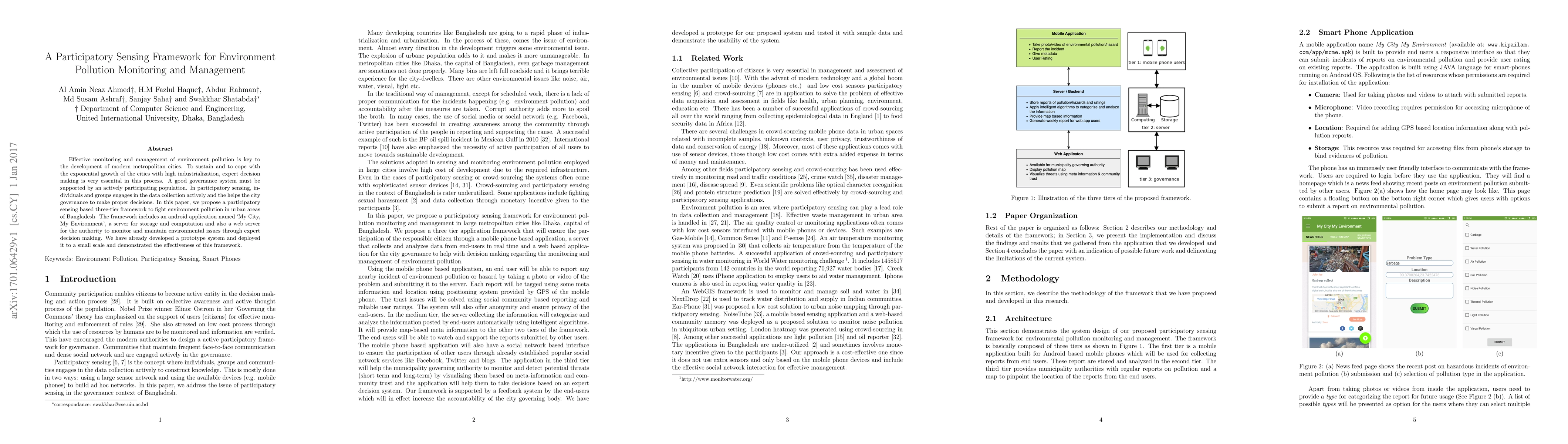 This paper proposes a participatory sensing framework for monitoring and managing environmental pollution in urban Bangladesh, featuring an Android app, a server for data storage and computation, and a web server for expert decision-making. The framework aims to engage citizens in data collection to support effective governance and has been demonstrated through a prototype system.