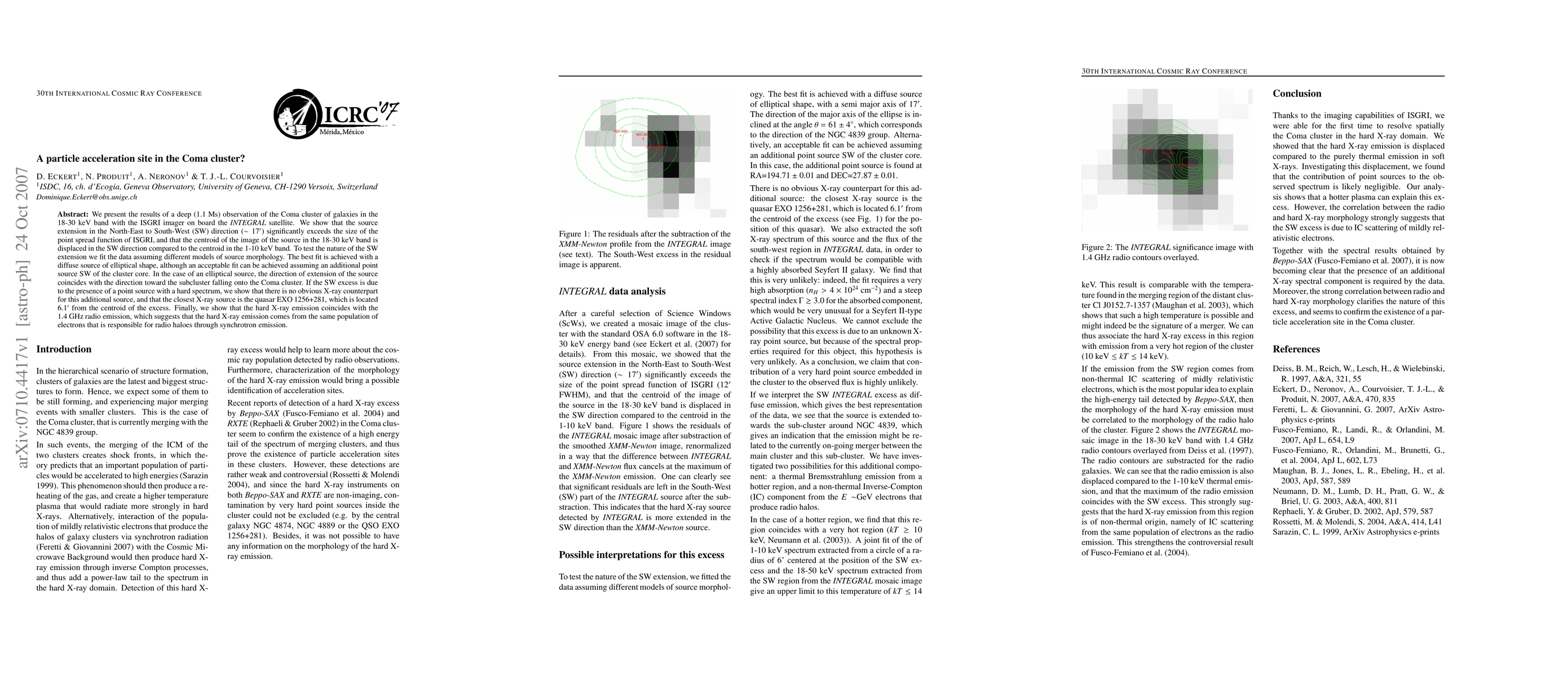 We present the results of a deep (1.1 Ms) observation of the Coma cluster of galaxies in the 18-30 keV band with the IBIS/ISGRI imager on board the INTEGRAL satellite. We show that the source extension in the North-East to South-West (SW) direction ($\sim 17'$) significantly exceeds the size of the point spread function of ISGRI, and that the centroid of the image of the source in the 18-30 keV band is displaced in the SW direction compared to the centroid in the 1-10 keV band. To test the nature of the SW extension we fit the data assuming different models of source morphology. The best fit is achieved with a diffuse source of elliptical shape, although an acceptable fit can be achieved assuming an additional point source SW of the cluster core. In the case of an elliptical source, the direction of extension of the source coincides with the direction toward the subcluster falling onto the Coma cluster. If the SW excess is due to the presence of a point source with a hard spectrum, we show that there is no obvious X-ray counterpart for this additional source, and that the closest X-ray source is the quasar EXO 1256+281, which is located $6.1'$ from the centroid of the excess. Finally, we show that the hard X-ray emission coincides with the 1.4 GHz radio emission, which suggests that the hard X-ray emission comes from the same population of electrons that is responsible for radio haloes through synchrotron emission.