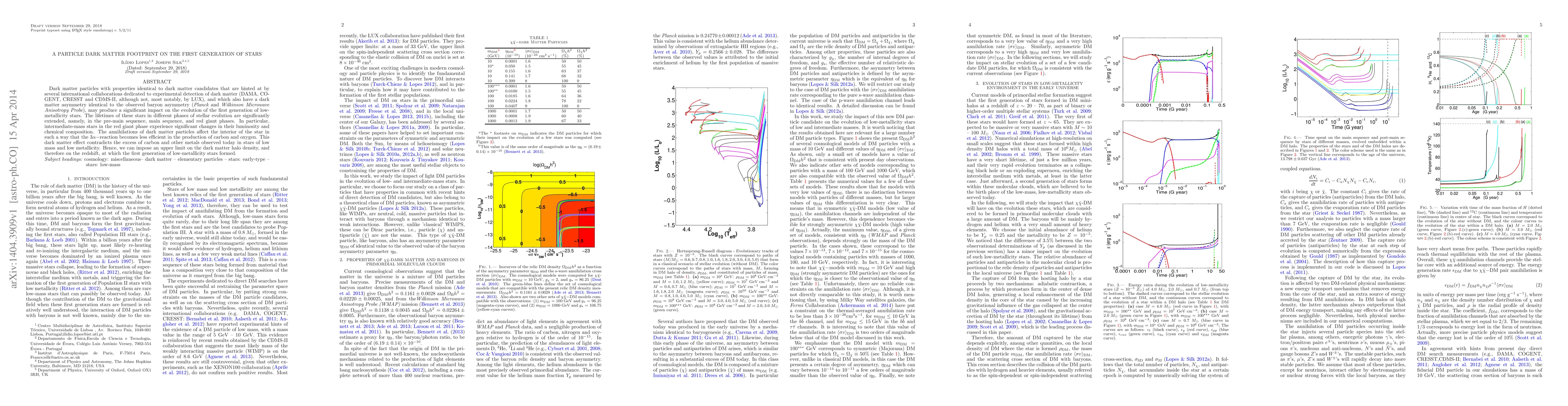 Dark matter particles with properties identical to dark matter candidates that are hinted at by several international collaborations dedicated to experimental detection of dark matter (DAMA, COGENT, CRESST and CDMS-II, although not, most notably, by LUX), and which also have a dark matter asymmetry identical to the observed baryon asymmetry (Planck and Wilkinson Microwave Anisotropy Probe), may produce a significant impact on the evolution of the first generation of low-metallicity stars. The lifetimes of these stars in different phases of stellar evolution are significantly extended, namely, in the pre-main sequence, main sequence, and red giant phases. In particular, intermediate-mass stars in the red giant phase experience significant changes in their luminosity and chemical composition. The annihilations of dark matter particles affect the interior of the star in such a way that the $3\alpha-$reaction becomes less efficient in the production of carbon and oxygen. This dark matter effect contradicts the excess of carbon and other metals observed today in stars of low mass and low metallicity. Hence, we can impose an upper limit on the dark matter halo density, and therefore on the redshift, at which the first generation of low-metallicity stars formed.