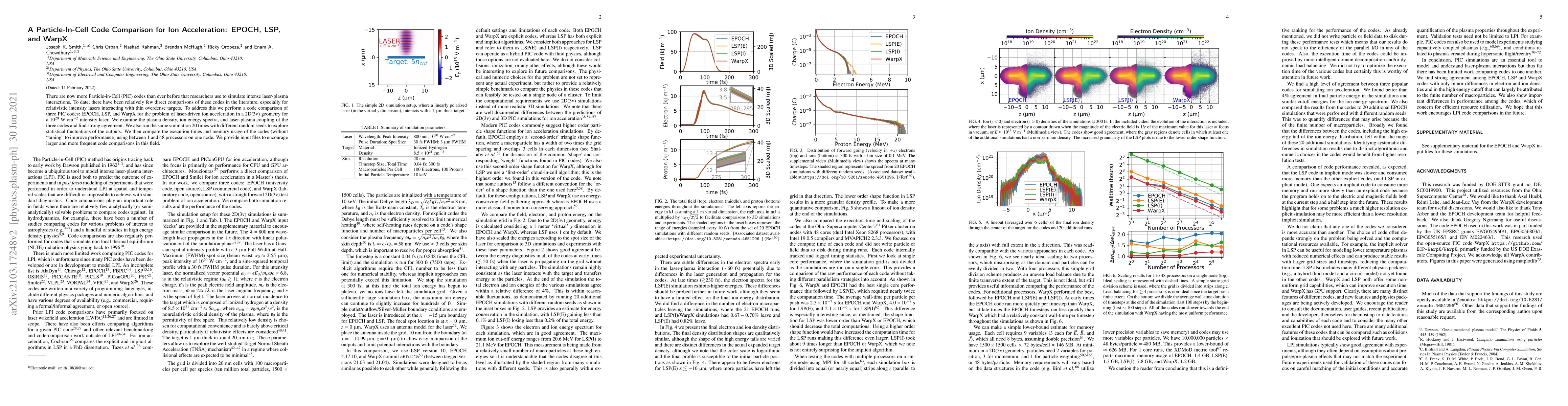 This paper compares three Particle-in-Cell codes—EPOCH, LSP, and WarpX—to simulate laser-driven ion acceleration, finding strong agreement in plasma density, ion energy spectra, and laser-plasma coupling. It also evaluates the execution times and memory usage of the codes across different processor counts.