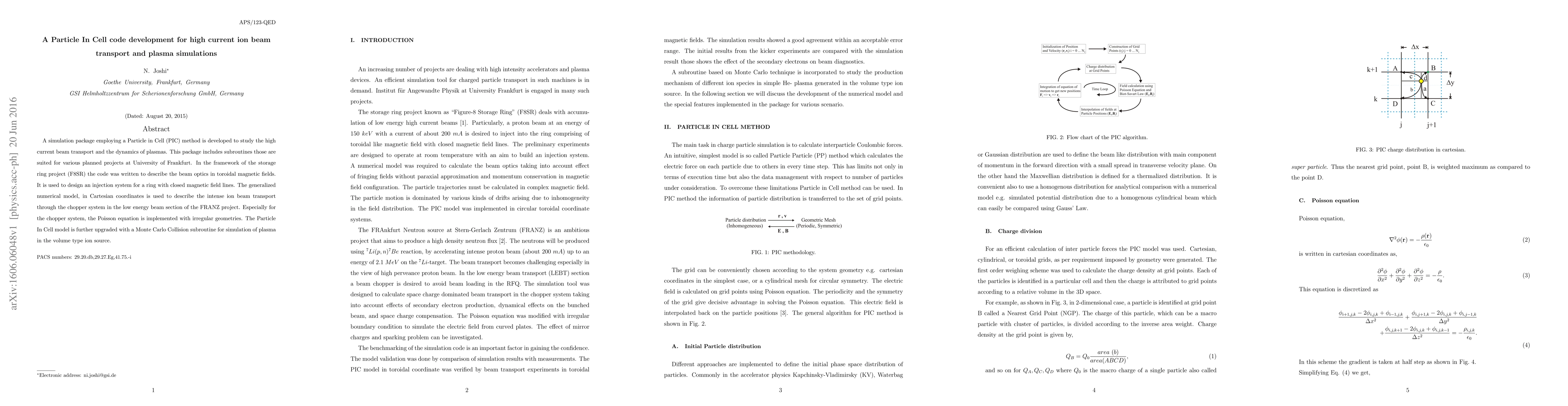 A simulation package employing a Particle in Cell (PIC) method is developed to study the high current beam transport and the dynamics of plasmas. This package includes subroutines those are suited for various planned projects at University of Frankfurt. In the framework of the storage ring project (F8SR) the code was written to describe the beam optics in toroidal magnetic fields. It is used to design an injection system for a ring with closed magnetic field lines. The generalized numerical model, in Cartesian coordinates is used to describe the intense ion beam transport through the chopper system in the low energy beam section of the FRANZ project. Especially for the chopper system, the Poisson equation is implemented with irregular geometries. The Particle In Cell model is further upgraded with a Monte Carlo Collision subroutine for simulation of plasma in the volume type ion source.