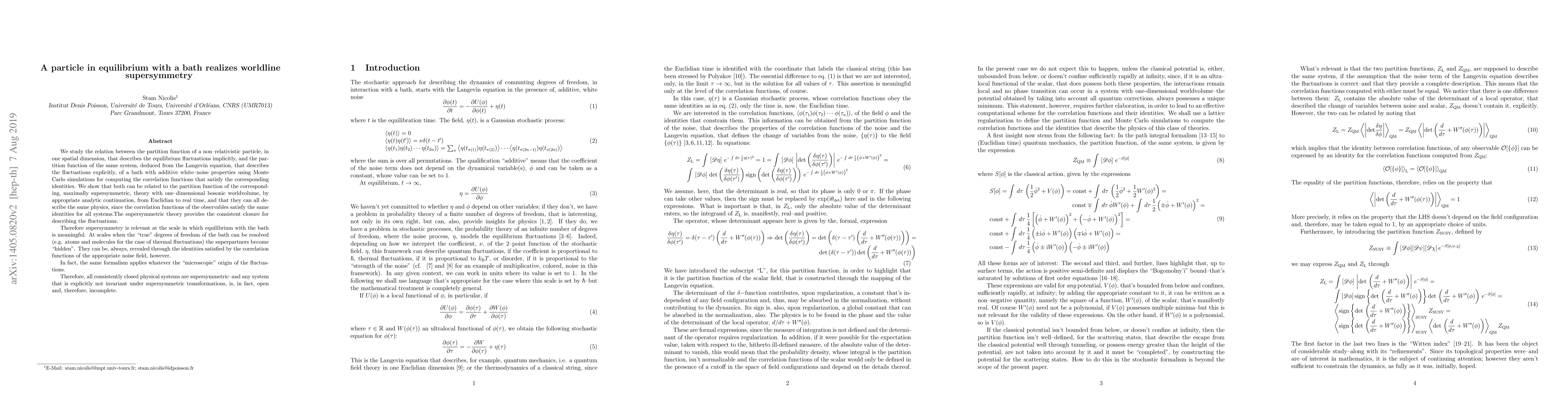 We study the relation between the partition function of a non--relativistic particle, in one spatial dimension, that describes the equilibrium fluctuations implicitly, and the partition function of the same system, deduced from the Langevin equation, that describes the fluctuations explicitly, of a bath with additive white--noise properties using Monte Carlo simulations for computing the correlation functions that satisfy the corresponding identities. We show that both can be related to the partition function of the corresponding, maximally supersymmetric, theory with one--dimensional bosonic worldvolume, by appropriate analytic continuation, from Euclidian to real time, and that they can all describe the same physics, since the correlation functions of the observables satisfy the same identities for all systems.The supersymmetric theory provides the consistent closure for describing the fluctuations. Therefore supersymmetry is relevant at the scale in which equilibrium with the bath is meaningful. At scales when the "true" degrees of freedom of the bath can be resolved (e.g. atoms and molecules for the case of thermal fluctuations) the superpartners become "hidden". They can be, always, revealed through the identities satisfied by the correlation functions of the appropriate noise field, however. In fact, the same formalism applies whatever the "microscopic" origin of the fluctuations. Therefore, all consistently closed physical systems are supersymmetric--and any system that is explicitly not invariant under supersymmetric transformations, is, in fact, open and, therefore, incomplete.