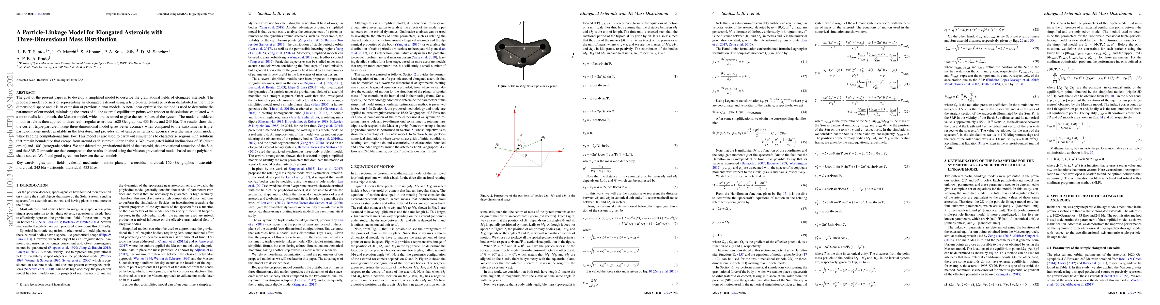The goal of the present paper is to develop a simplified model to describe the gravitational fields of elongated asteroids. The proposed model consists of representing an elongated asteroid using a triple-particle-linkage system distributed in the three-dimensional space. It is an extension of previous models that focused only on planar models. A non-linear optimization method is used to determine the parameters of our model, minimizing the errors of all the external equilibrium points with respect to the solutions calculated with a more realistic model, the polyhedron model, which are assumed to be the real values of the system. The model considered in this article is then applied to three real irregular asteroids 1620 Geographos, 433 Eros and 243, Ida. The results show that the current triple-particle-linkage three-dimensional model gives better accuracy when compared to the axisymmetric triple-particle-linkage model available in the literature, and provides an advantage in terms of accuracy over the mass point model, while keeping computational time low. Also, this model is used to carry out simulations to characterize regions with solutions that remain bounded or that escape from around each asteroid under analysis. We investigated an initial inclination of 0 degree (direct orbits) and 180 degrees (retrograde orbits). We considered the gravitational field of the asteroid, the gravitational attraction of the Sun, and the solar radiation pressure Our results are then compared to the results obtained using the Mascon gravitational model based on the polyhedral shape source. We found good agreement between the two models.