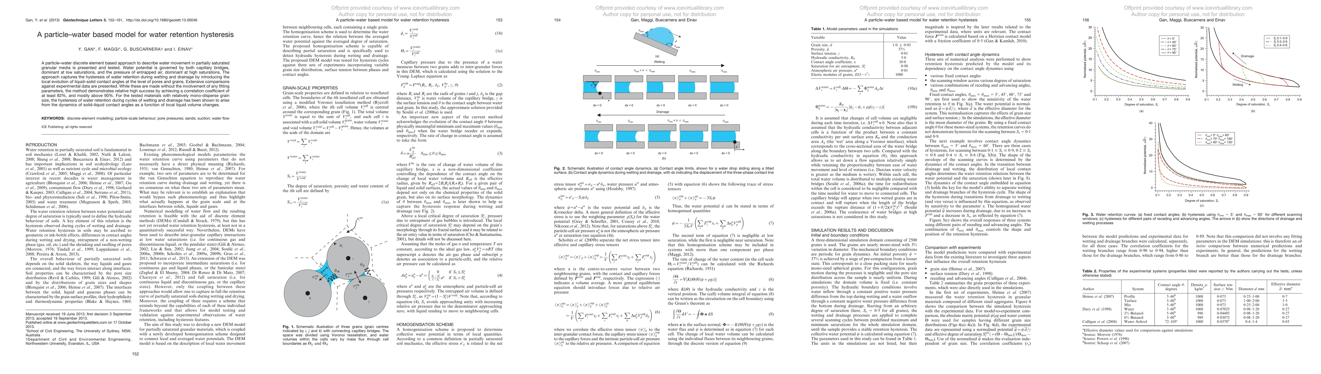 A particle-water discrete element based approach to describe water movement in partially saturated granular media is presented and tested. Water potential is governed by both capillary bridges, dominant at low saturations, and the pressure of entrapped air, dominant at high saturations. The approach captures the hysteresis of water retention during wetting and drainage by introducing the local evolution of liquid-solid contact angles at the level of pores and grains. Extensive comparisons against experimental data are presented. While these are made without the involvement of any fitting parameters, the method demonstrates relative high success by achieving a correlation coefficient of at least 82%, and mostly above 90%. For the tested materials with relatively mono-disperse grain size, the hysteresis of water retention during cycles of wetting and drainage has been shown to arise from the dynamics of solid-liquid contact angles as a function of local liquid volume changes.