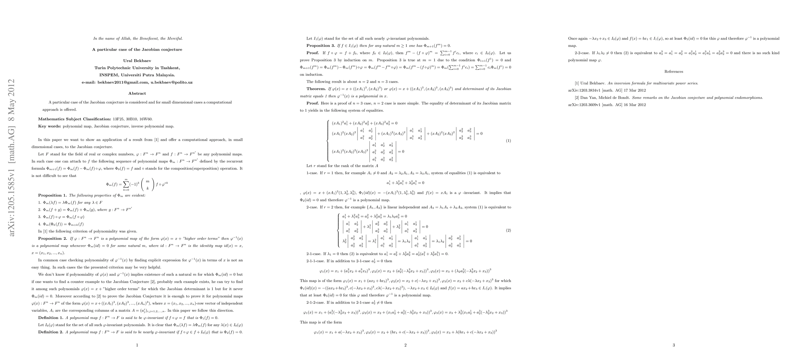 A particular case of the Jacobian conjecture is considered and for small dimensional cases a computational approach is offered