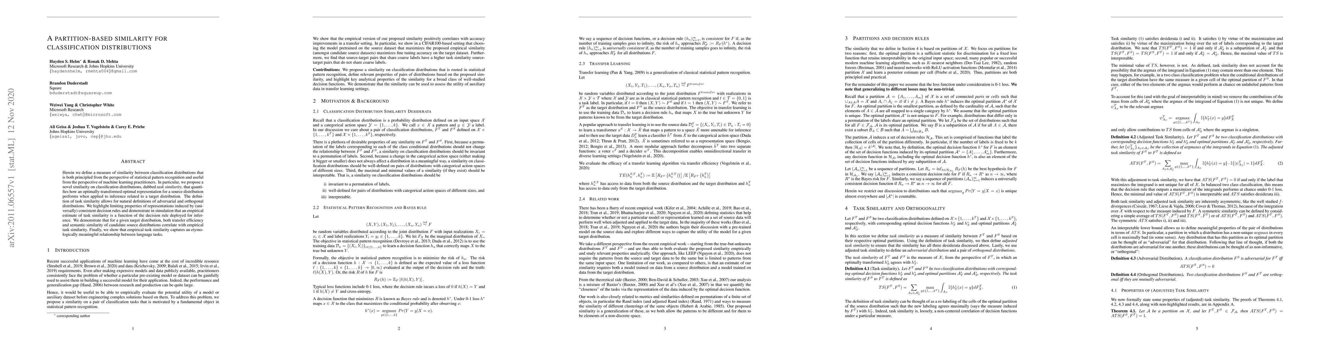 Herein we define a measure of similarity between classification distributions that is both principled from the perspective of statistical pattern recognition and useful from the perspective of machine learning practitioners. In particular, we propose a novel similarity on classification distributions, dubbed task similarity, that quantifies how an optimally-transformed optimal representation for a source distribution performs when applied to inference related to a target distribution. The definition of task similarity allows for natural definitions of adversarial and orthogonal distributions. We highlight limiting properties of representations induced by (universally) consistent decision rules and demonstrate in simulation that an empirical estimate of task similarity is a function of the decision rule deployed for inference. We demonstrate that for a given target distribution, both transfer efficiency and semantic similarity of candidate source distributions correlate with empirical task similarity.