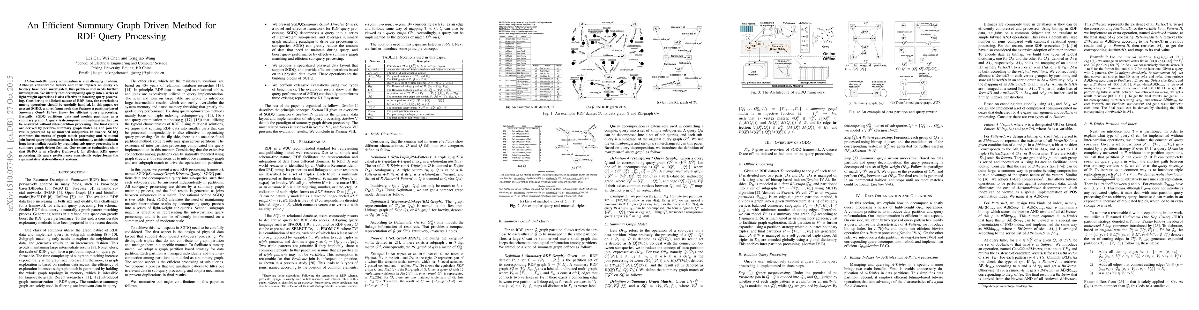 This paper introduces SGDQ, a partition-based framework for efficient RDF query processing that decomposes queries into lightweight operations and models data partitions as a summary graph. SGDQ optimizes query performance by avoiding large intermediate results through summary graph matching and subquery joining.