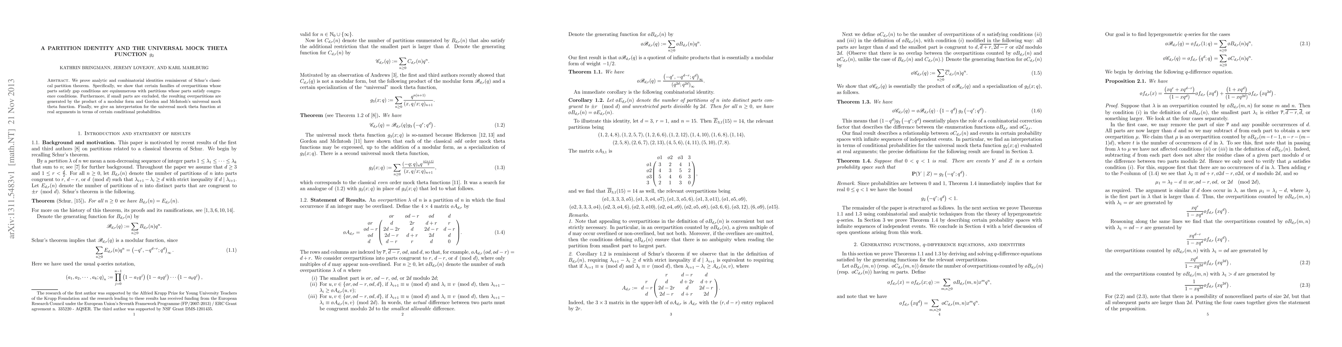 We prove analytic and combinatorial identities reminiscent of Schur's classical partition theorem. Specifically, we show that certain families of overpartitions whose parts satisfy gap conditions are equinumerous with partitions whose parts satisfy congruence conditions. Furthermore, if small parts are excluded, the resulting overpartitions are generated by the product of a modular form and Gordon and McIntosh's universal mock theta function. Finally, we give an interpretation for the universal mock theta function at real arguments in terms of certain conditional probabilities.