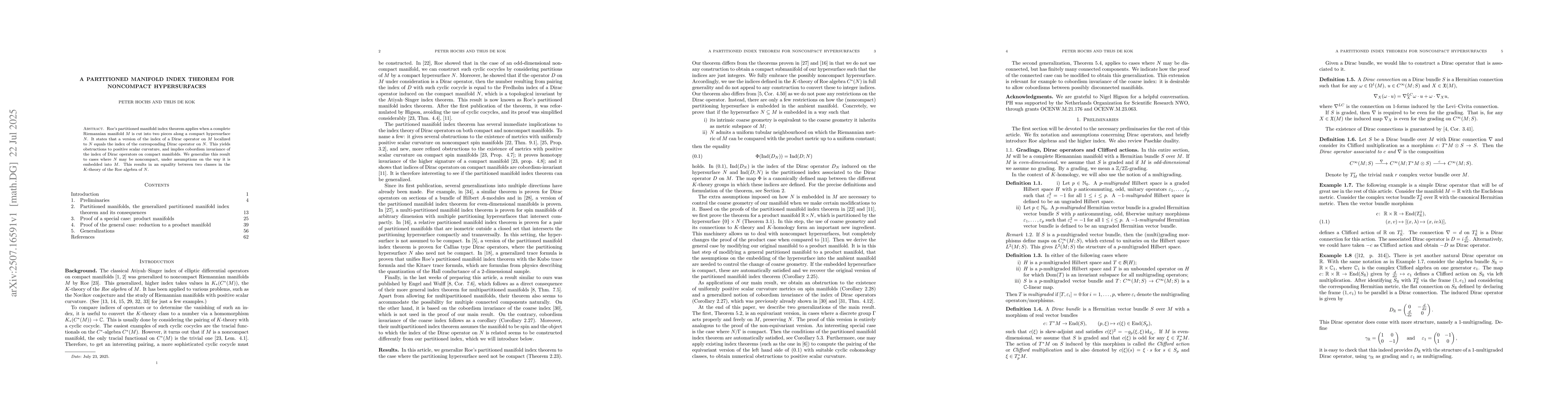 Roe's partitioned manifold index theorem applies when a complete Riemannian manifold $M$ is cut into two pieces along a compact hypersurface $N$. It states that a version of the index of a Dirac operator on $M$ localized to $N$ equals the index of the corresponding Dirac operator on $N$. This yields obstructions to positive scalar curvature, and implies cobordism invariance of the index of Dirac operators on compact manifolds. We generalize this result to cases where $N$ may be noncompact, under assumptions on the way it is embedded into $M$. This results in an equality between two classes in the $K$-theory of the Roe algebra of $N$.