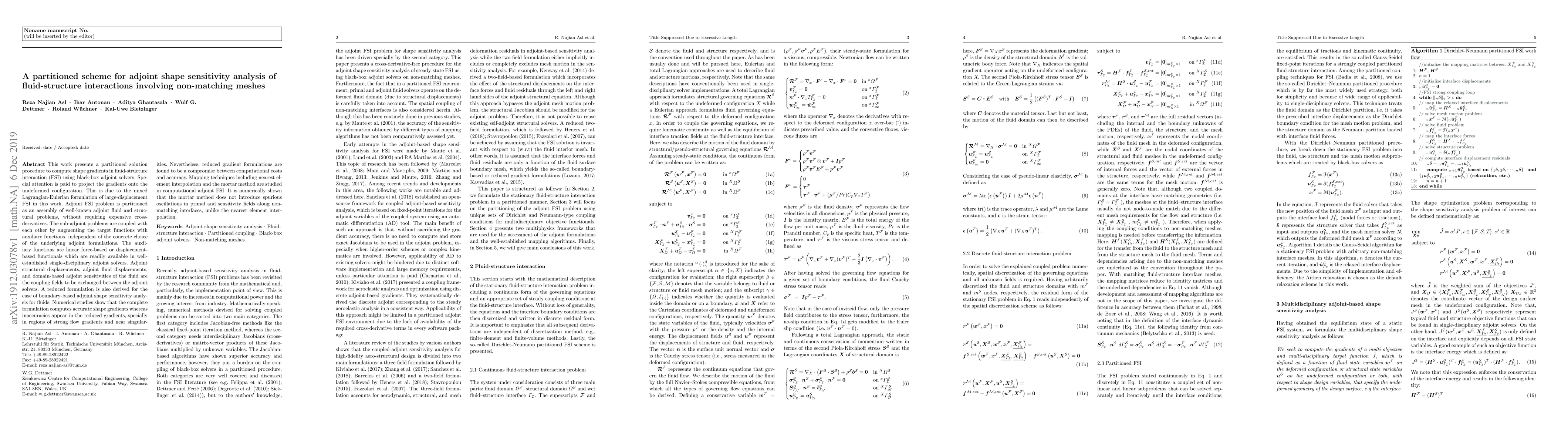 This paper introduces a partitioned scheme for adjoint shape sensitivity analysis in fluid-structure interactions (FSI) using non-matching meshes, employing black-box adjoint solvers. The method accurately computes shape gradients without requiring cross-derivatives, and uses auxiliary functions to couple sub-adjoint problems, showing reduced but cost-effective gradient accuracy in certain regions.