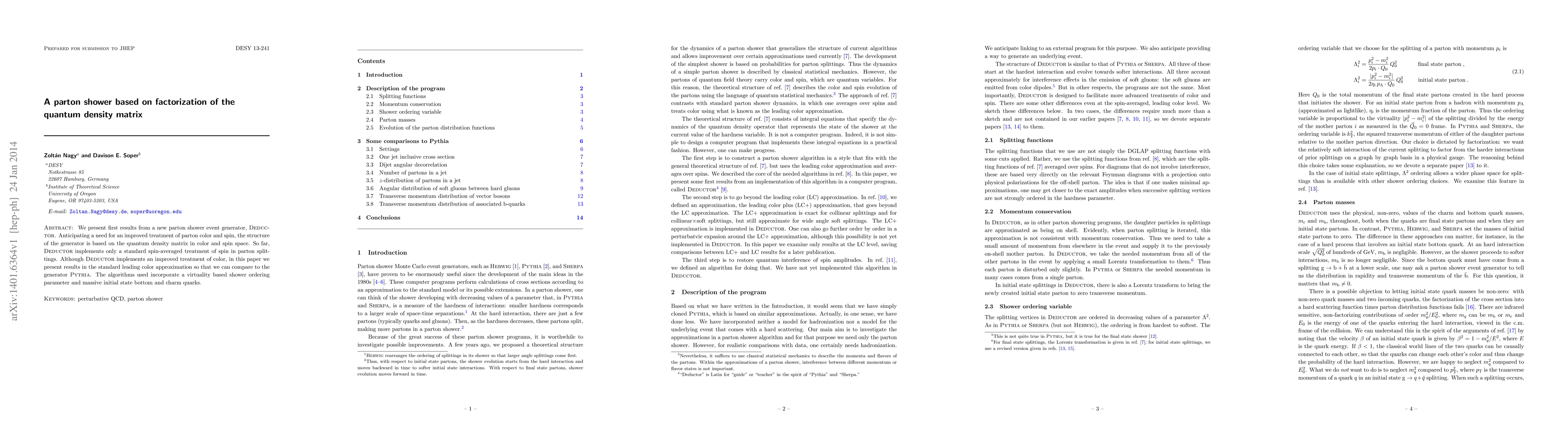 The paper introduces Deductor, a novel parton shower event generator based on the quantum density matrix for color and spin. Initial results, compared to Pythia, showcase an advanced color treatment and massive initial state bottom and charm quarks, with spin averaging and leading color approximation applied.