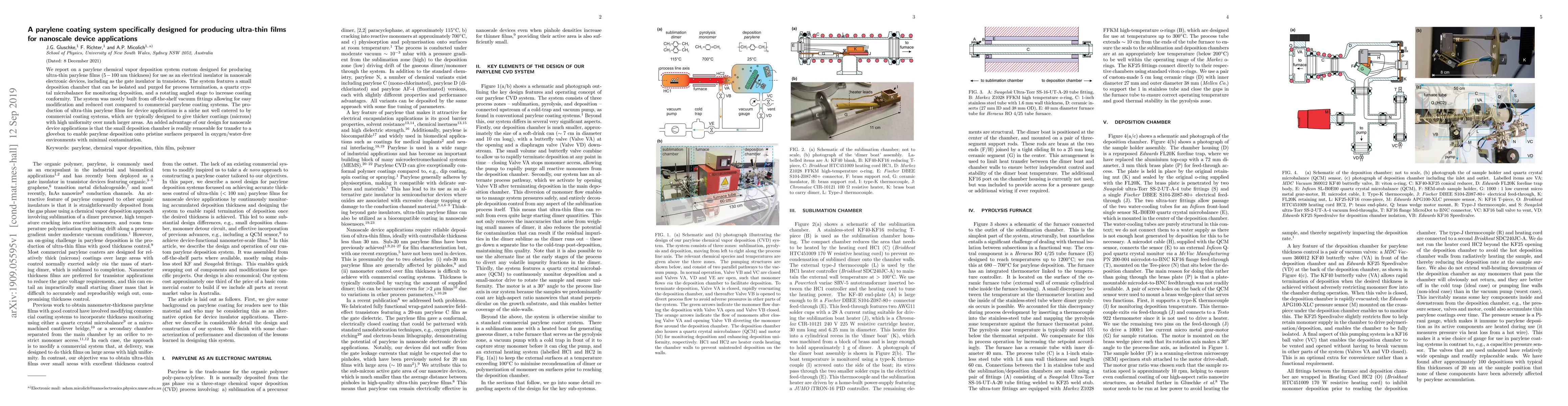 This paper describes a custom-built parylene chemical vapor deposition system designed for producing ultra-thin films (5-100 nm) for nanoscale electronic devices, featuring a small, removable chamber, a quartz crystal microbalance, and a rotating stage for enhanced conformity. The system is cost-effective and allows for deposition in oxygen/water-free environments.