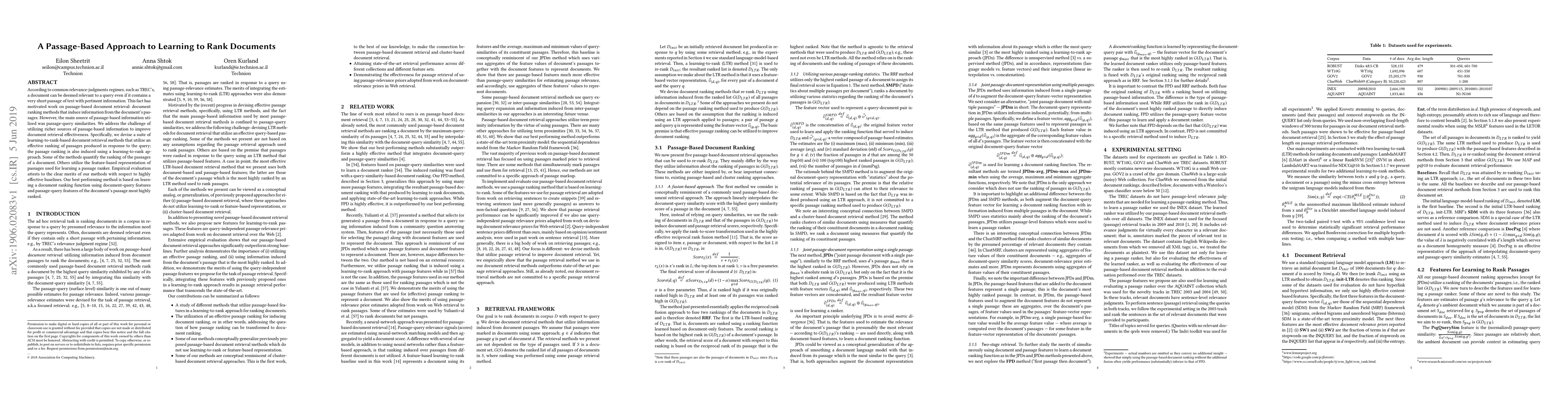 Researchers developed new methods for ranking documents based on their most relevant passages, achieving highly effective results and improving upon existing passage-based retrieval approaches. Their best method uses a combination of document and query features to learn an optimal document ranking function.