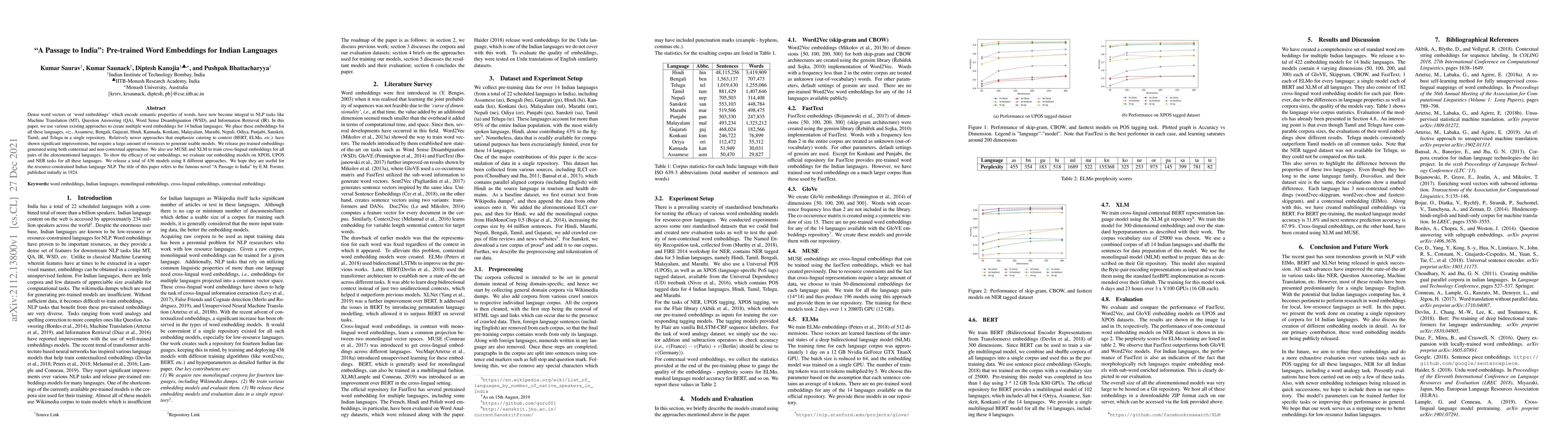 Dense word vectors or 'word embeddings' which encode semantic properties of words, have now become integral to NLP tasks like Machine Translation (MT), Question Answering (QA), Word Sense Disambiguation (WSD), and Information Retrieval (IR). In this paper, we use various existing approaches to create multiple word embeddings for 14 Indian languages. We place these embeddings for all these languages, viz., Assamese, Bengali, Gujarati, Hindi, Kannada, Konkani, Malayalam, Marathi, Nepali, Odiya, Punjabi, Sanskrit, Tamil, and Telugu in a single repository. Relatively newer approaches that emphasize catering to context (BERT, ELMo, etc.) have shown significant improvements, but require a large amount of resources to generate usable models. We release pre-trained embeddings generated using both contextual and non-contextual approaches. We also use MUSE and XLM to train cross-lingual embeddings for all pairs of the aforementioned languages. To show the efficacy of our embeddings, we evaluate our embedding models on XPOS, UPOS and NER tasks for all these languages. We release a total of 436 models using 8 different approaches. We hope they are useful for the resource-constrained Indian language NLP. The title of this paper refers to the famous novel 'A Passage to India' by E.M. Forster, published initially in 1924.