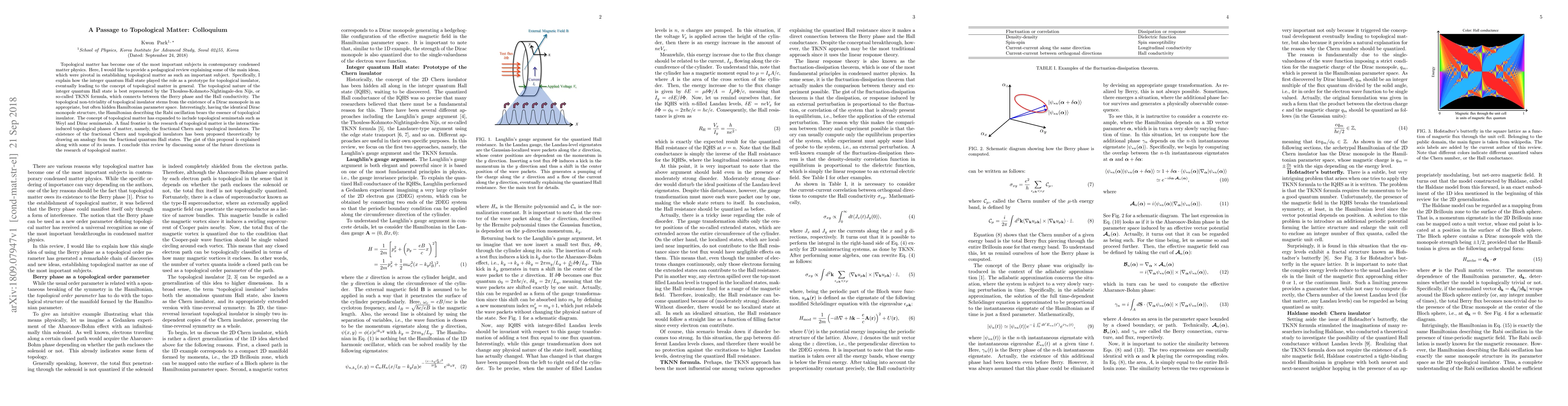 Topological matter has become one of the most important subjects in contemporary condensed matter physics. Here, I would like to provide a pedagogical review explaining some of the main ideas, which were pivotal in establishing topological matter as such an important subject. Specifically, I explain how the integer quantum Hall state played the role as a prototype for topological insulator, eventually leading to the concept of topological matter in general. The topological nature of the integer quantum Hall state is best represented by the Thouless-Kohmoto-Nightingale-den Nijs, or so-called TKNN formula, which connects between the Berry phase and the Hall conductivity. The topological non-triviality of topological insulator stems from the existence of a Dirac monopole in an appropriate, but often hidden Hamiltonian parameter space. Interestingly, having the identical Dirac monopole structure, the Hamiltonian describing the Rabi oscillation bears the essence of topological insulator. The concept of topological matter has expanded to include topological semimetals such as Weyl and Dirac semimetals. A final frontier in the research of topological matter is the interaction-induced topological phases of matter, namely, the fractional Chern and topological insulators. The existence of the fractional Chern and topological insulators has been proposed theoretically by drawing an analogy from the fractional quantum Hall states. The gist of this proposal is explained along with some of its issues. I conclude this review by discussing some of the future directions in the research of topological matter.