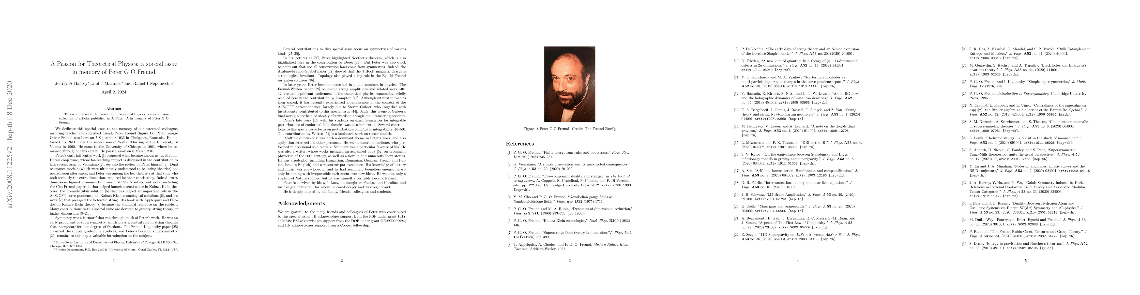This special issue of J. Phys. A honors the legacy of Peter G. O. Freund through a collection of articles dedicated to his contributions to theoretical physics. It reflects the passion and influence he had on the field.