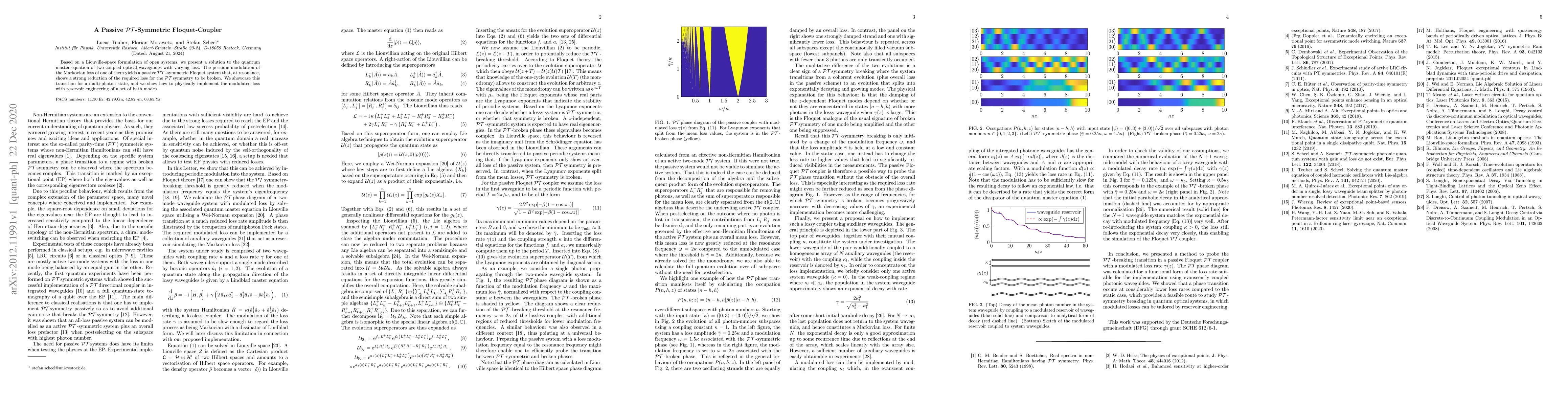 This paper proposes a solution to the quantum master equation for two coupled optical waveguides with modulated loss, demonstrating a passive $\mathcal{PT}$-symmetric Floquet system that significantly reduces required loss for $\mathcal{PT}$ symmetry breaking at resonance. The authors also detail a physical implementation using reservoir engineering of bath modes.