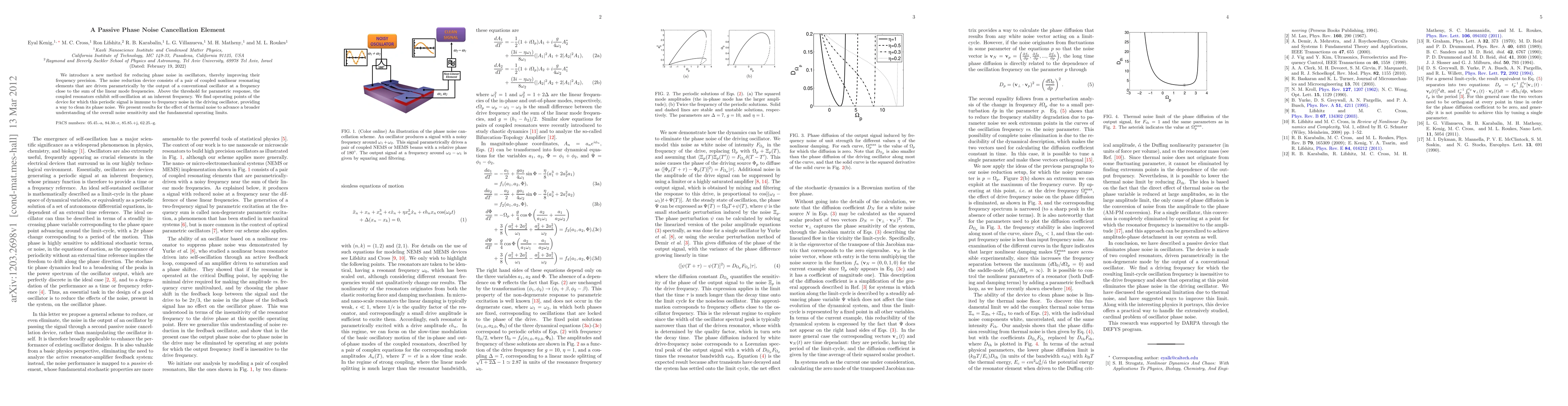 This paper proposes a novel passive method for reducing phase noise in oscillators using coupled nonlinear resonating elements driven parametrically. The method achieves noise cancellation by leveraging self-oscillation in the coupled resonators, providing a cleaner phase signal and improving frequency precision.