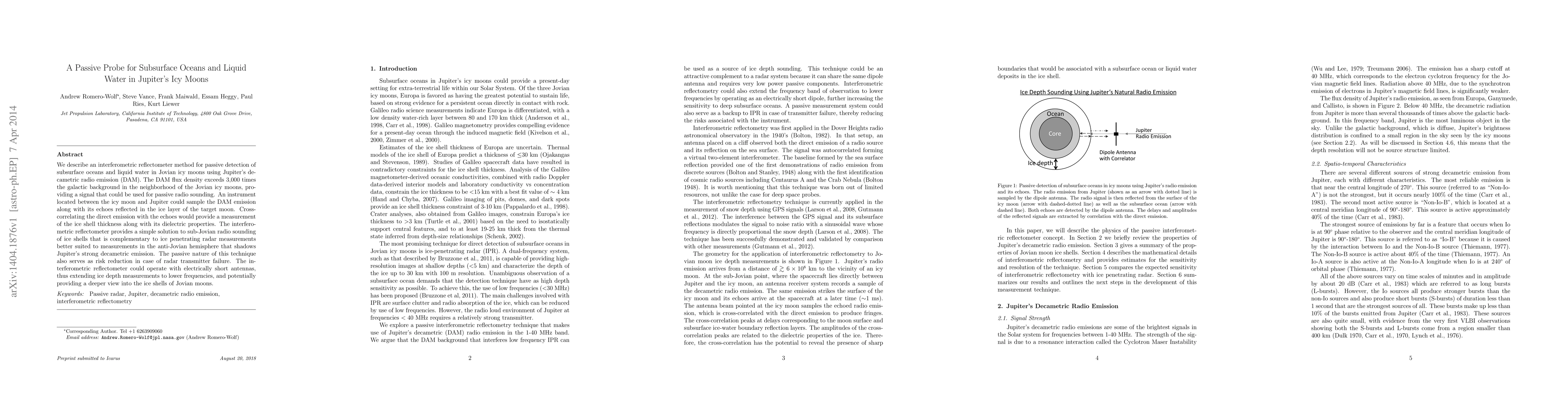 This paper proposes an interferometric reflectometer method to passively detect subsurface oceans and liquid water in Jupiter's icy moons by analyzing Jupiter's decametric radio emission (DAM). The technique correlates DAM direct emissions with their echoes reflected off the moons' ice layers to measure ice shell thickness and dielectric properties, offering a risk-reduced alternative to radar.