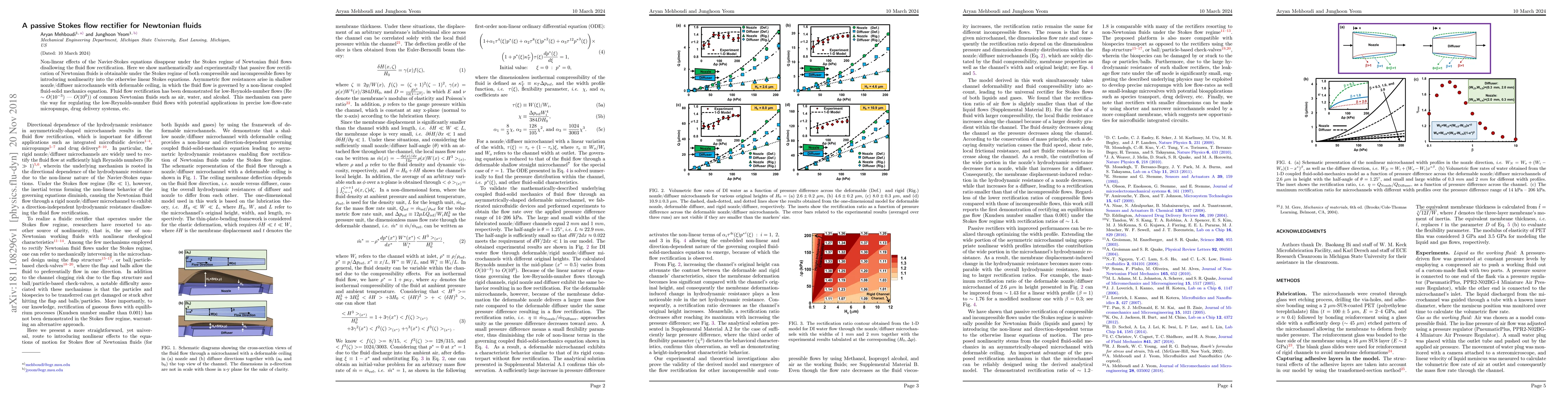 This paper demonstrates mathematically and experimentally that passive rectification of Newtonian fluids is possible under the Stokes regime by introducing nonlinearity into the linear Stokes equations. The method utilizes asymmetric flow resistances in deformable microchannel structures, enabling fluid flow regulation for low-Reynolds-number applications like micropumps and drug delivery systems.