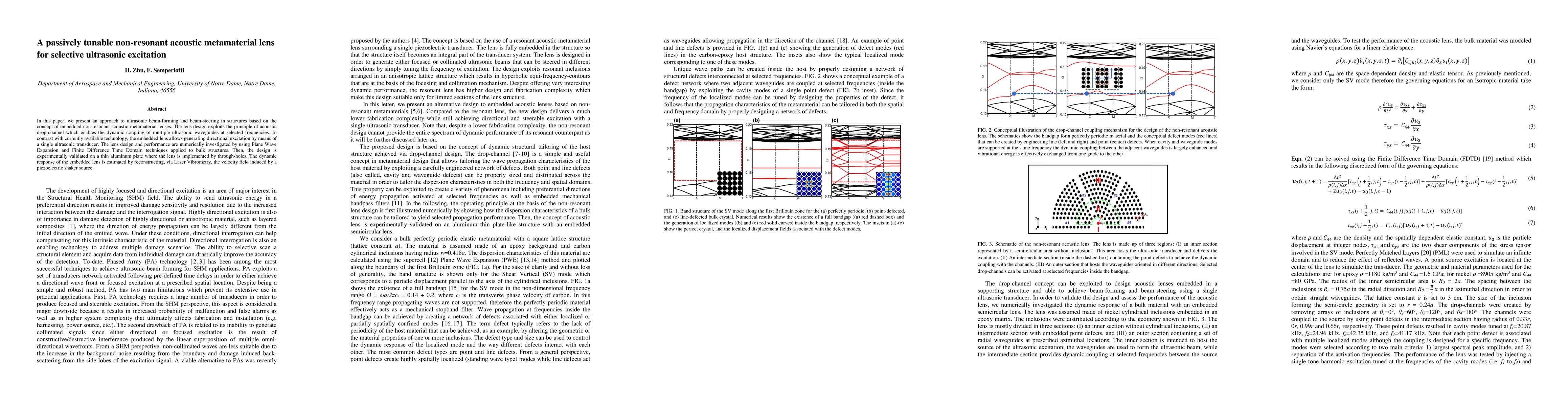 In this paper, we present an approach to ultrasonic beam-forming and beam-steering in structures based on the concept of embedded non-resonant acoustic metamaterial lenses. The lens design exploits the principle of acoustic drop-channel which enables the dynamic coupling of multiple ultrasonic waveguides at selected frequencies. In contrast with currently available technology, the embedded lens allows generating directional excitation by means of a single ultrasonic transducer. The lens design and performance are numerically investigated by using Plane Wave Expansion and Finite Difference Time Domain techniques applied to bulk structures. Then, the design is experimentally validated on a thin aluminum plate where the lens is implemented by through-holes. The dynamic response of the embedded lens is estimated by reconstructing, via Laser Vibrometry, the velocity field induced by a piezoelectric shaker source.