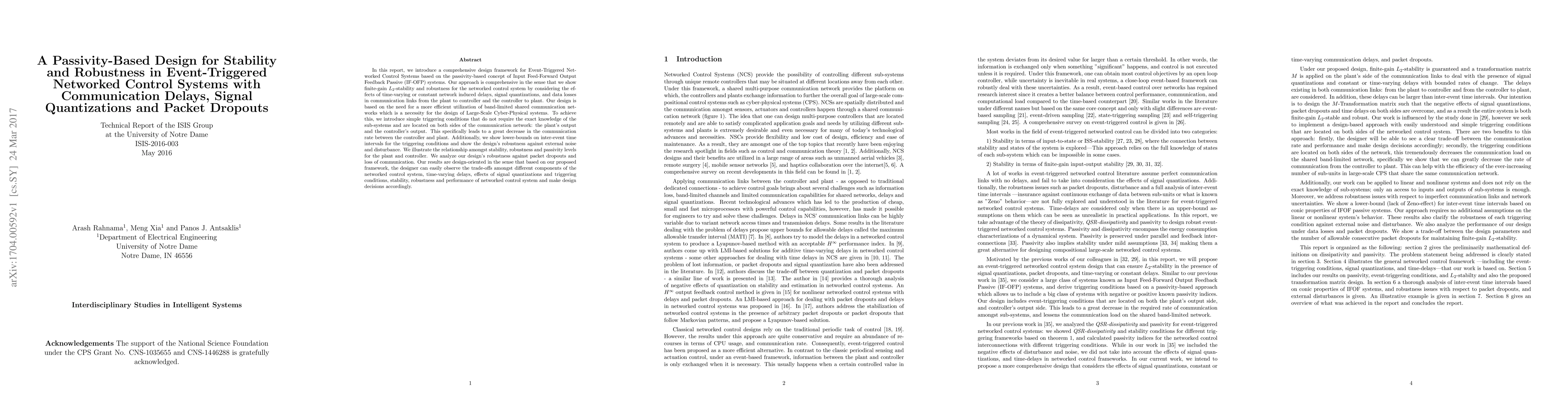 In this report, we introduce a comprehensive design framework for Event-Triggered Networked Control Systems based on the passivity-based concept of Input Feed-Forward Output Feedback Passive (IF-OFP) systems. Our approach is comprehensive in the sense that we show finite-gain $L_2$-stability and robustness for the networked control system by considering the effects of time-varying or constant network induced delays, signal quantizations, and data losses in communication links from the plant to controller and the controller to plant. Our design is based on the need for a more efficient utilization of band-limited shared communication networks which is a necessity for the design of Large-Scale Cyber-Physical systems. To achieve this, we introduce simple triggering conditions that do not require the exact knowledge of the sub-systems and are located on both sides of the communication network: the plant's output and the controller's output. This specifically leads to a great decrease in the communication rate between the controller and plant. Additionally, we show lower-bounds on inter-event time intervals for the triggering conditions and show the design's robustness against external noise and disturbance. We illustrate the relationship amongst stability, robustness and passivity levels for the plant and controller. We analyze our design's robustness against packet dropouts and loss of communication. Our results are design-oriented in the sense that based on our proposed framework, the designer can easily observe the trade-offs amongst different components of the networked control system, time-varying delays, effects of signal quantizations and triggering conditions, stability, robustness and performance of networked control system and make design decisions accordingly.