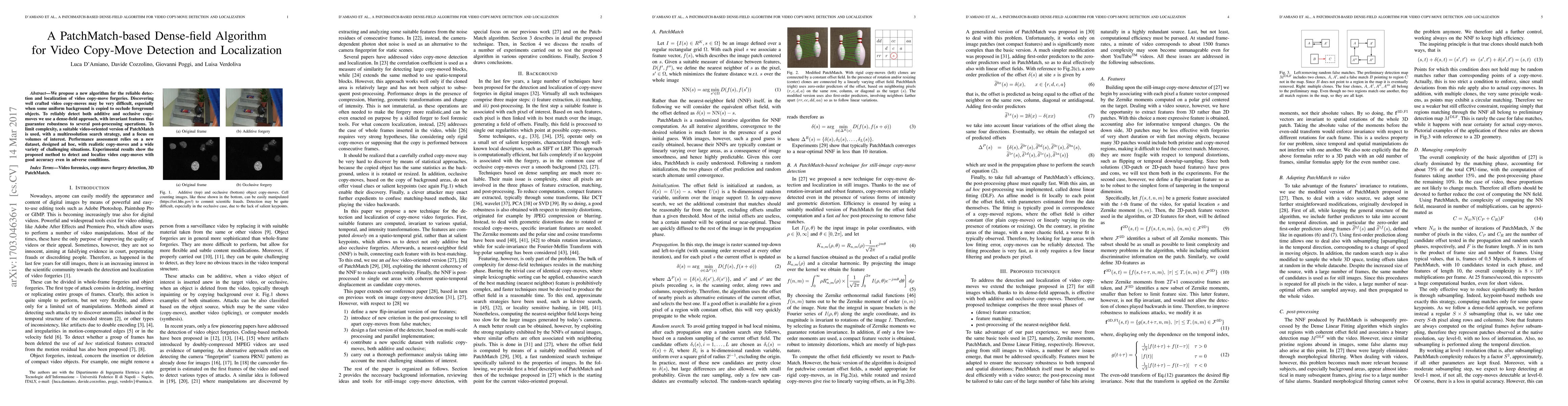 We propose a new algorithm for the reliable detection and localization of video copy-move forgeries. Discovering well crafted video copy-moves may be very difficult, especially when some uniform background is copied to occlude foreground objects. To reliably detect both additive and occlusive copy-moves we use a dense-field approach, with invariant features that guarantee robustness to several post-processing operations. To limit complexity, a suitable video-oriented version of PatchMatch is used, with a multiresolution search strategy, and a focus on volumes of interest. Performance assessment relies on a new dataset, designed ad hoc, with realistic copy-moves and a wide variety of challenging situations. Experimental results show the proposed method to detect and localize video copy-moves with good accuracy even in adverse conditions.
