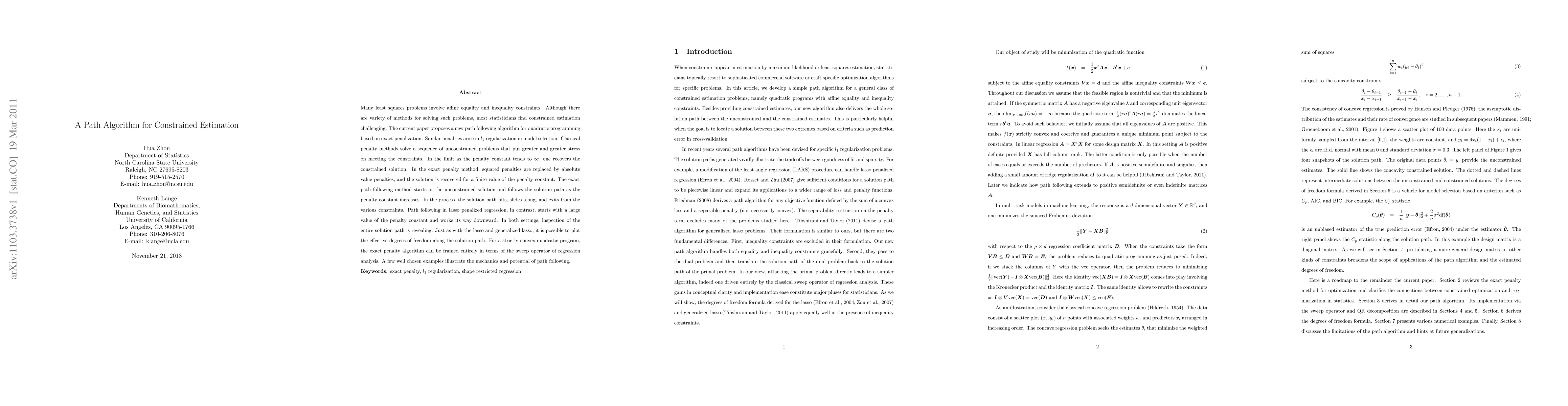 This paper introduces a new path following algorithm for constrained estimation in quadratic programming using exact penalization, which follows the solution path as the penalty constant increases, contrasting with traditional lasso methods. The method is illustrated through examples and can be framed using the sweep operator of regression analysis.