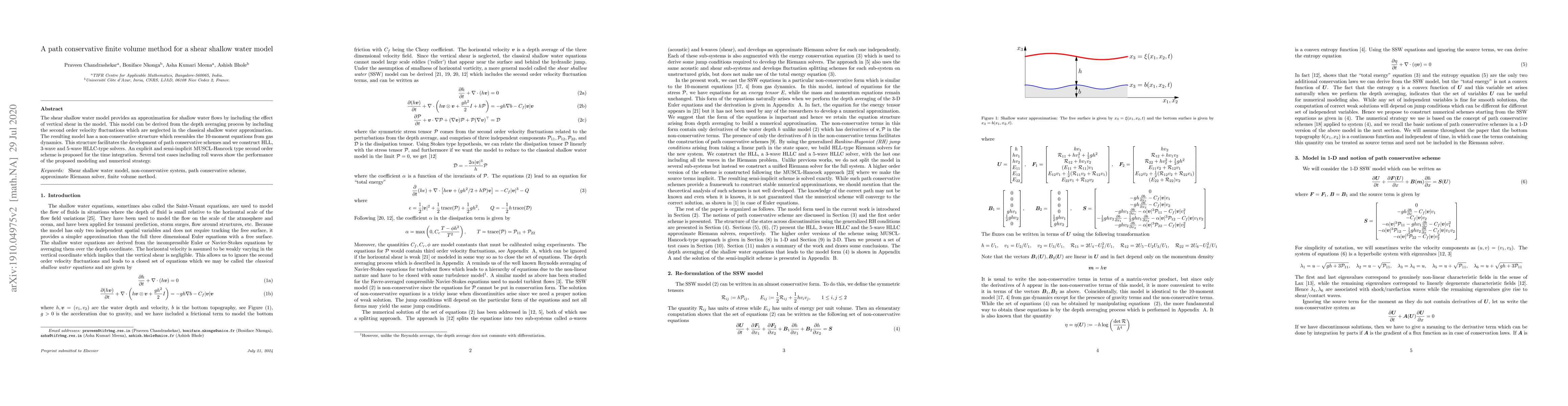 This paper develops a path conservative finite volume method for a shear shallow water model that accounts for vertical shear effects, proposing HLL, 3-wave, and 5-wave HLLC-type solvers along with a second-order MUSCL-Hancock scheme for time integration. The method is validated through various test cases, including roll waves.