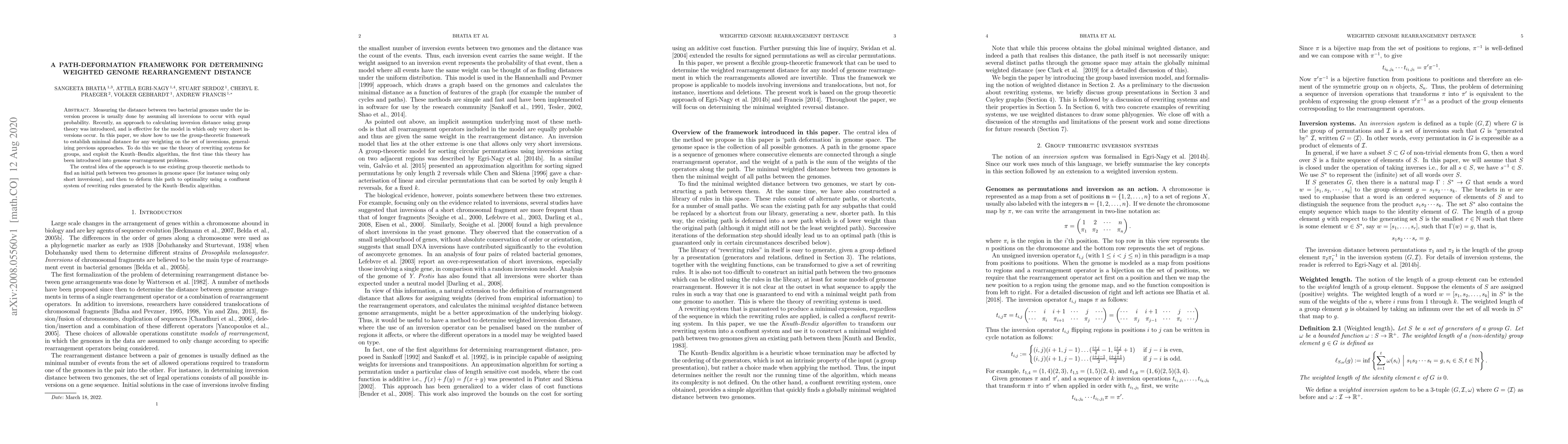 This paper introduces a group-theoretic framework for calculating weighted genome rearrangement distances by using a path-deformation approach. It employs the Knuth-Bendix algorithm and rewriting systems to generalize minimal distance calculations beyond short inversions, optimizing the initial path between genomes.